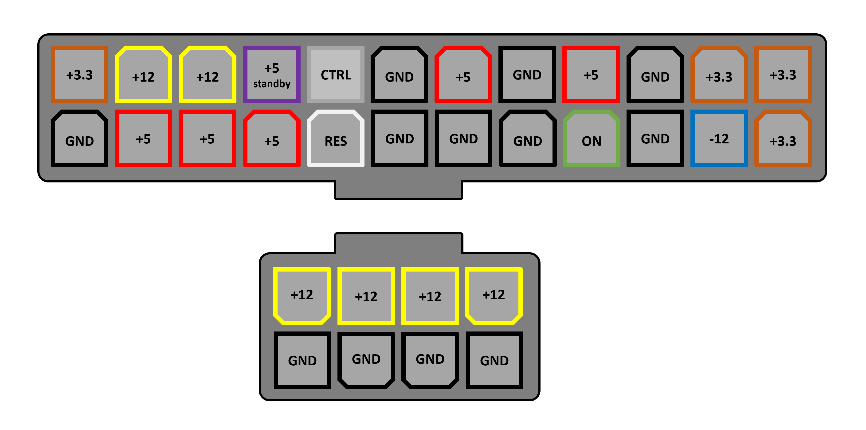 Les connecteurs de la PSU ont des fils codés par couleur pour aider à identifier à quoi sert chaque fil, mais les prises sur la carte mère ne vous en disent pas beaucoup. Voici un schéma pour les deux prises de courant: