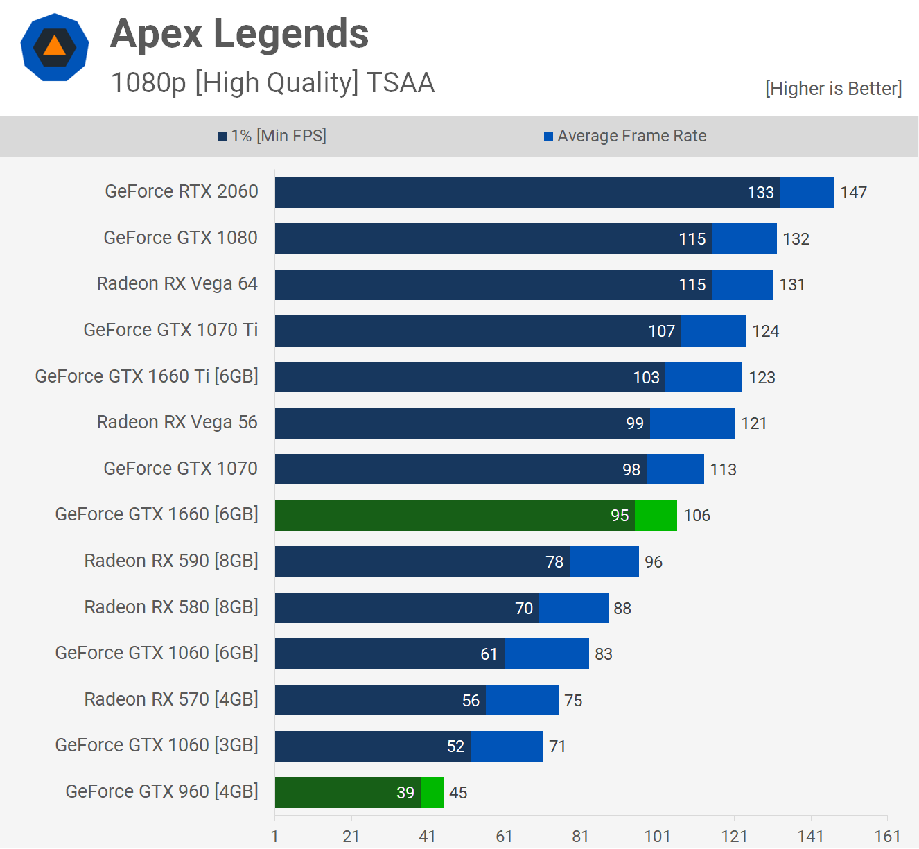 Jouer avec Apex Legends en 1080p avec le préréglage de haute qualité n’est pas très amusant avec une GTX 960. Vous recherchez des fréquences d’affichage toujours bien inférieures à 60 ips, loin d’être idéales pour un jeu de tir à la première personne rapide. Ceux qui ne veulent pas réduire la qualité visuelle devront mettre à niveau et la nouvelle GTX 1660 offre une amélioration substantielle des performances de 136% avec une cadence moyenne de 106 images par seconde.