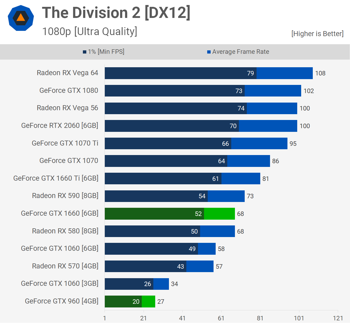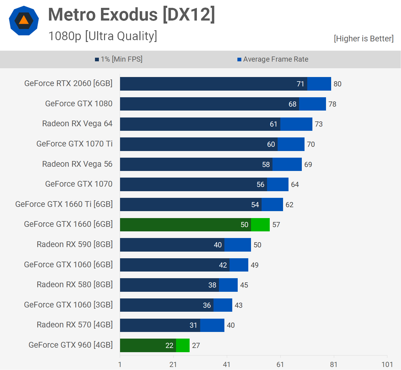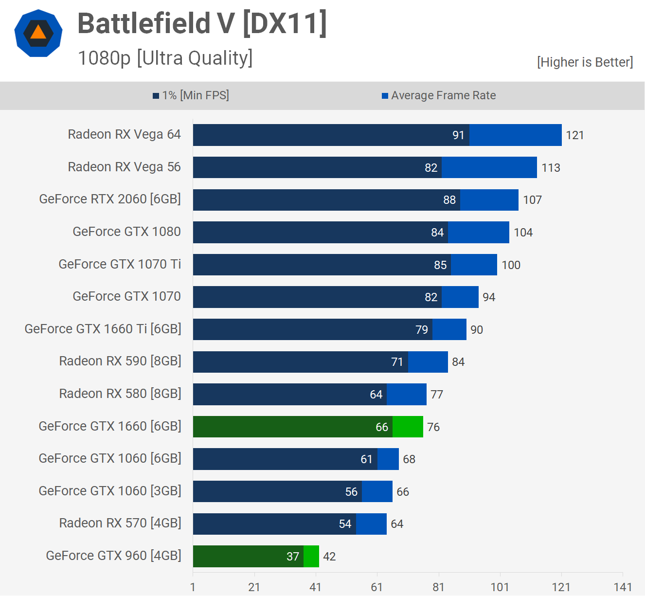 Battlefield V est un résultat intéressant car c’est l’un des plus petits deltas que nous ayons trouvés pour les 1660 sur les 960, sur les 33 jeux testés. Ici, le GPU de Turing était 81% plus rapide. Encore une grosse marge mais étant donné que nous avons généralement vu plus du double de performances sur les 1660, c’est une petite surprise.