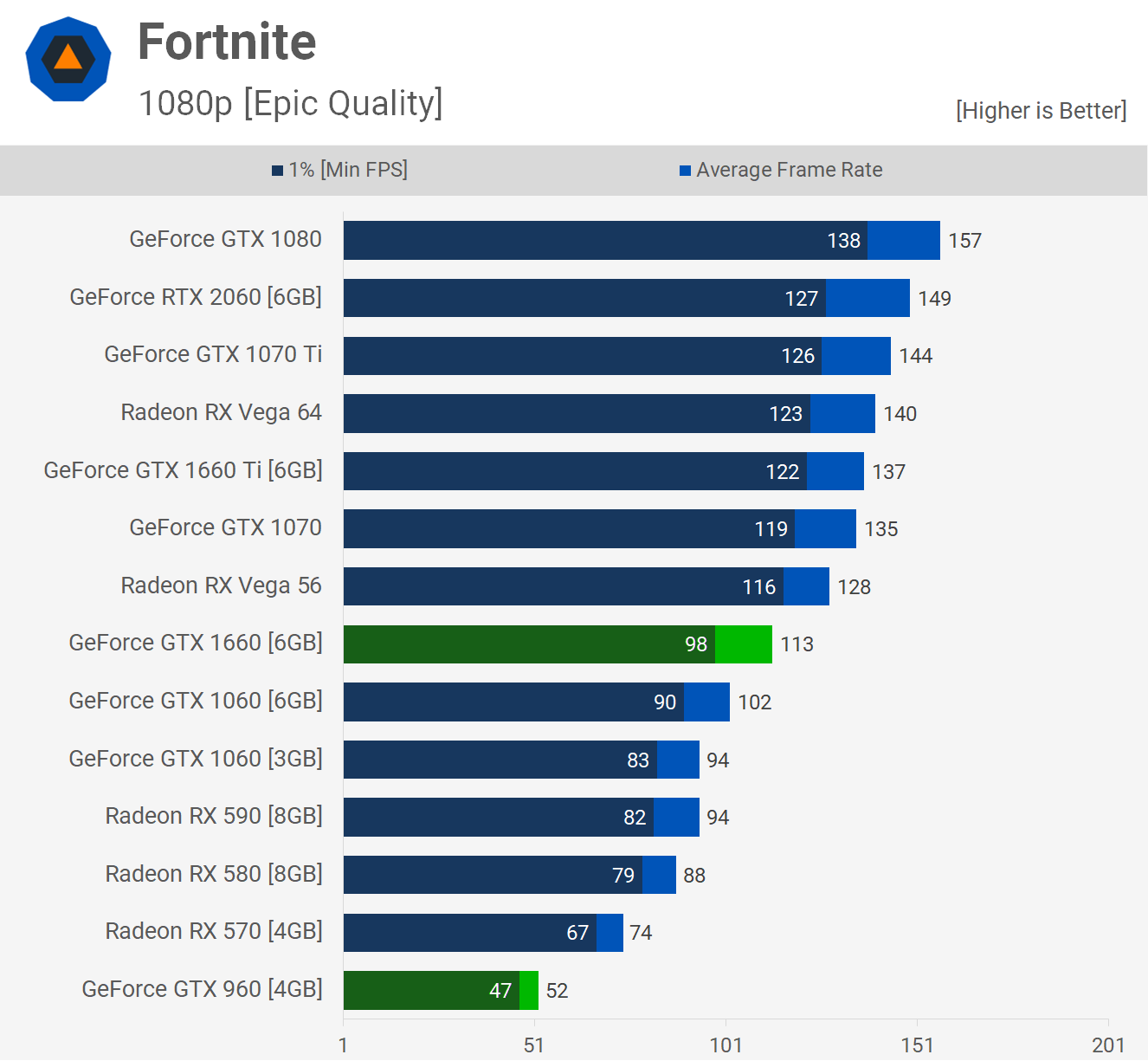 De tous les jeux que nous avons évalués jusqu'à présent, Fortnite est de loin le moins exigeant. En tant que tel, la GTX 960 était bonne pour 52 images par seconde en moyenne et nous utilisons le préréglage de qualité Epic. Ainsi, avec des réglages compétitifs, la GTX 960 dépasserait les 60 images par seconde en 1080p. Cependant, si vous voulez 144 ips + avec des réglages compétitifs, la GTX 1660 sera nécessaire et même si le préréglage Epic est activé, la moyenne est toujours de 113 ips.