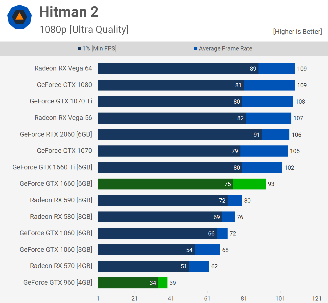 Hitman 2 était également jouable avec la GeForce GTX 960 et il ne faudrait pas grand-chose pour rappeler les paramètres de qualité afin d’atteindre 60 fps. Cela dit, si vous souhaitez profiter de Hitman avec les paramètres de qualité Ultra activés, optez pour une solution telle que la GTX 1660, car elle génère en moyenne 93 images par seconde beaucoup plus impressionnantes.
