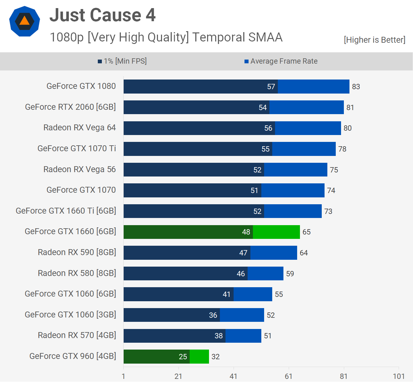 La GTX 960 fait un travail décent dans Forza Horizon 4, à condition que vous disposiez du modèle 4 Go. Malgré cela, la GTX 1660 offrait toujours une augmentation de 126% de ses performances, atteignant 95 ips en moyenne et avec plus de deux fois plus de trames extraites chaque seconde, elle offrait une expérience de jeu nettement plus fluide.
