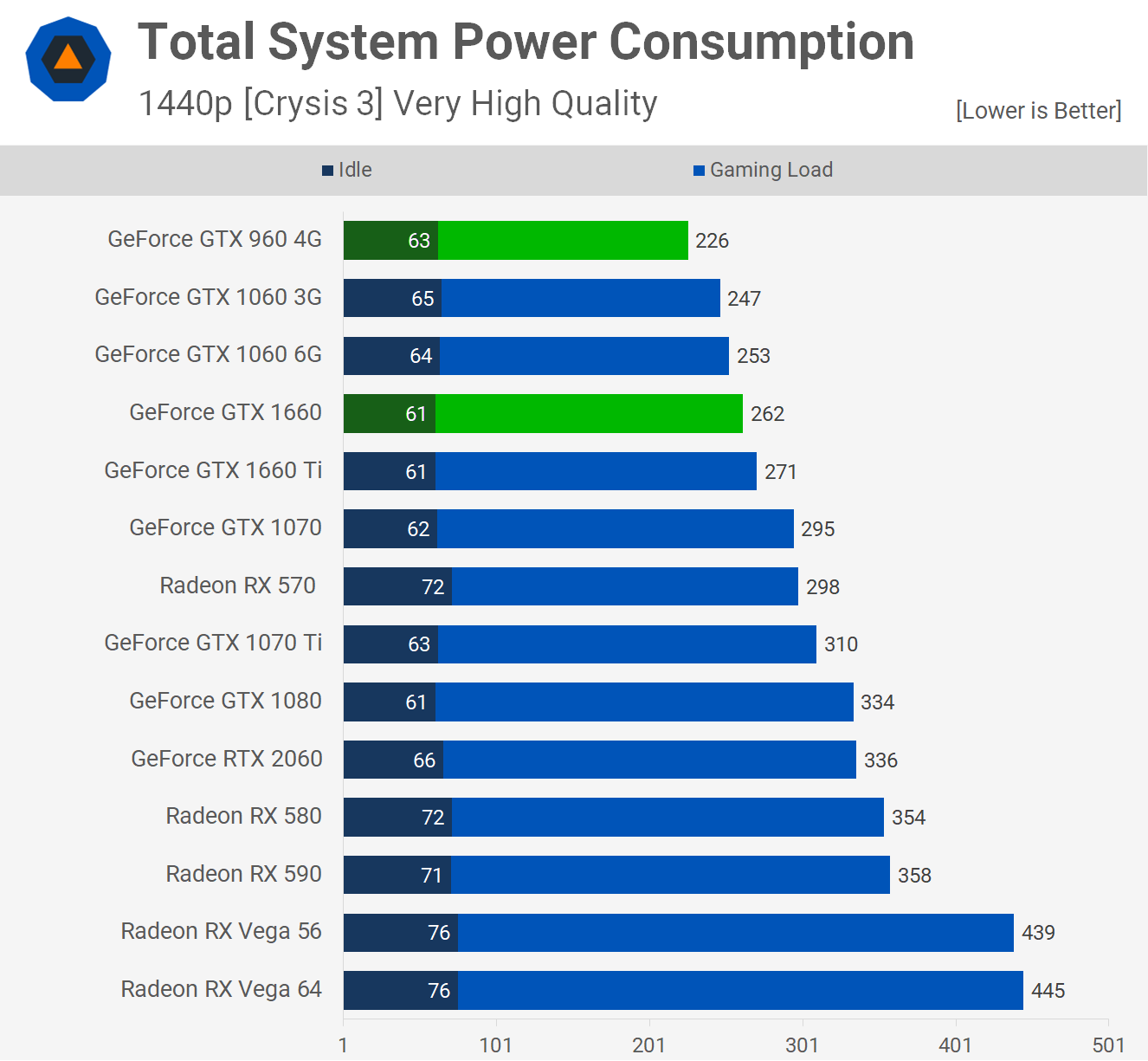 En termes de consommation d'énergie, nous constatons à quel point la GTX 1660 basée à Turing est impressionnante en termes d'efficacité. Malgré des performances souvent deux fois supérieures à celles de la GTX 960, l’utilisation totale du système n’a augmenté que de 16%, atteignant 262 watts. Même aux normes actuelles, la GTX 960 n’est pas terrible et vous vous en sortirez avec une alimentation très modeste.
