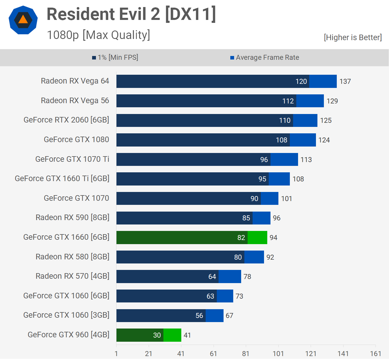 Nous constatons ici une tendance plutôt cohérente. Les tests avec Resident Evil 2 ont montré que la GTX 1660 offrait 129% de performances en plus en 1080p avec la qualité prédéfinie activée. Plus que doubler la cadence donne évidemment lieu à des améliorations significatives du jeu. Même s’il ne s’agit pas d’un jeu qui nécessite nécessairement une cadence élevée, le mouvement plus fluide ajoute sans aucun doute à l'expérience.
