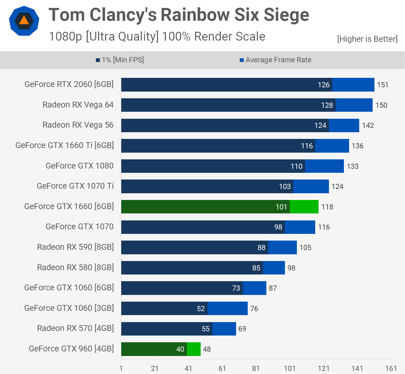 Nous devons admettre que nous nous attendions à ce que la GTX 960 se comporte plutôt bien dans Rainbow Six Siege. Alors que 48 images par seconde en moyenne sont jouables, nous nous attendions à plus, bien que, pour y penser, nous ne sachions pas exactement pourquoi, étant donné le RX 570, il ne donne que 69 images par seconde en moyenne. Cela signifie que la mise à niveau de la GTX 1660 vous donnerait un gain de performances appréciable de 146%, atteignant 118 ips en moyenne.