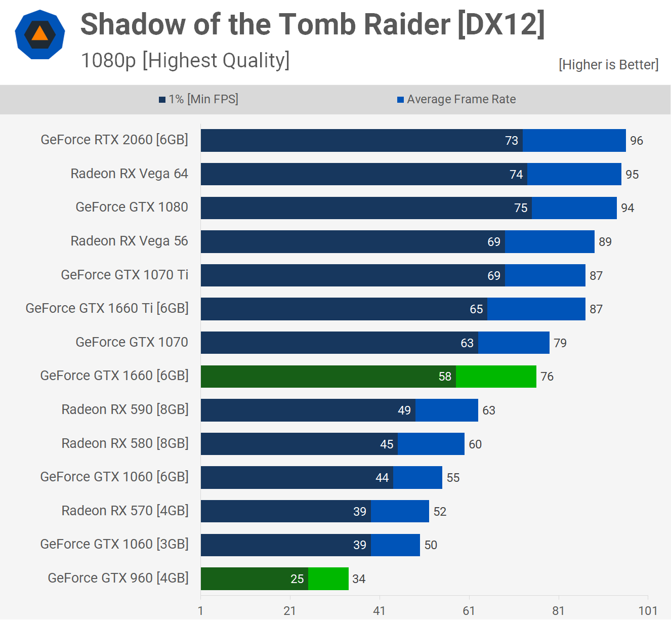 Nous trouvons une situation similaire lors des tests avec Shadow of the Tomb Raider, en utilisant le préréglage de la plus haute qualité, l’ancien GPU GeForce ne produisant que 34 images par seconde en moyenne et un creux de trame dans les années 20. Pendant ce temps, grâce à la performance exceptionnelle de 124% offerte par la GTX 1660, le jeu pouvait désormais être utilisé dans toute sa splendeur en 1080p.
