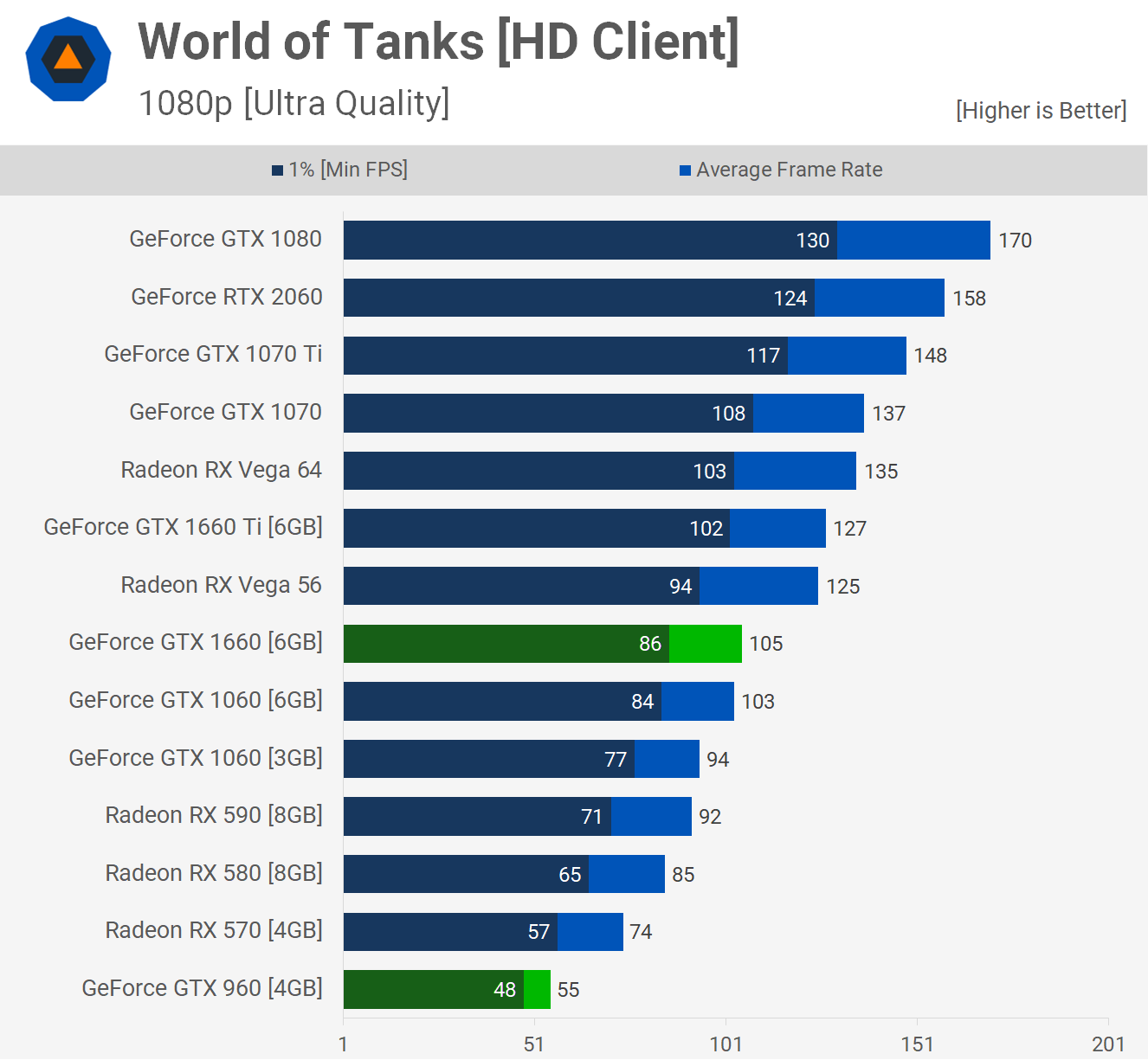 Bien que World of Tanks ait récemment fait l’objet d’une refonte majeure et que nous testions avec le client HD, il reste très bien optimisé pour le matériel plus ancien. Par exemple, la GTX 960 était bonne à 55 ips en moyenne et c’est une performance très jouable dans ce titre. Néanmoins, si vous recherchez plus de performances, la GTX 1660 peut vous aider avec une belle hausse de performances de 91%.