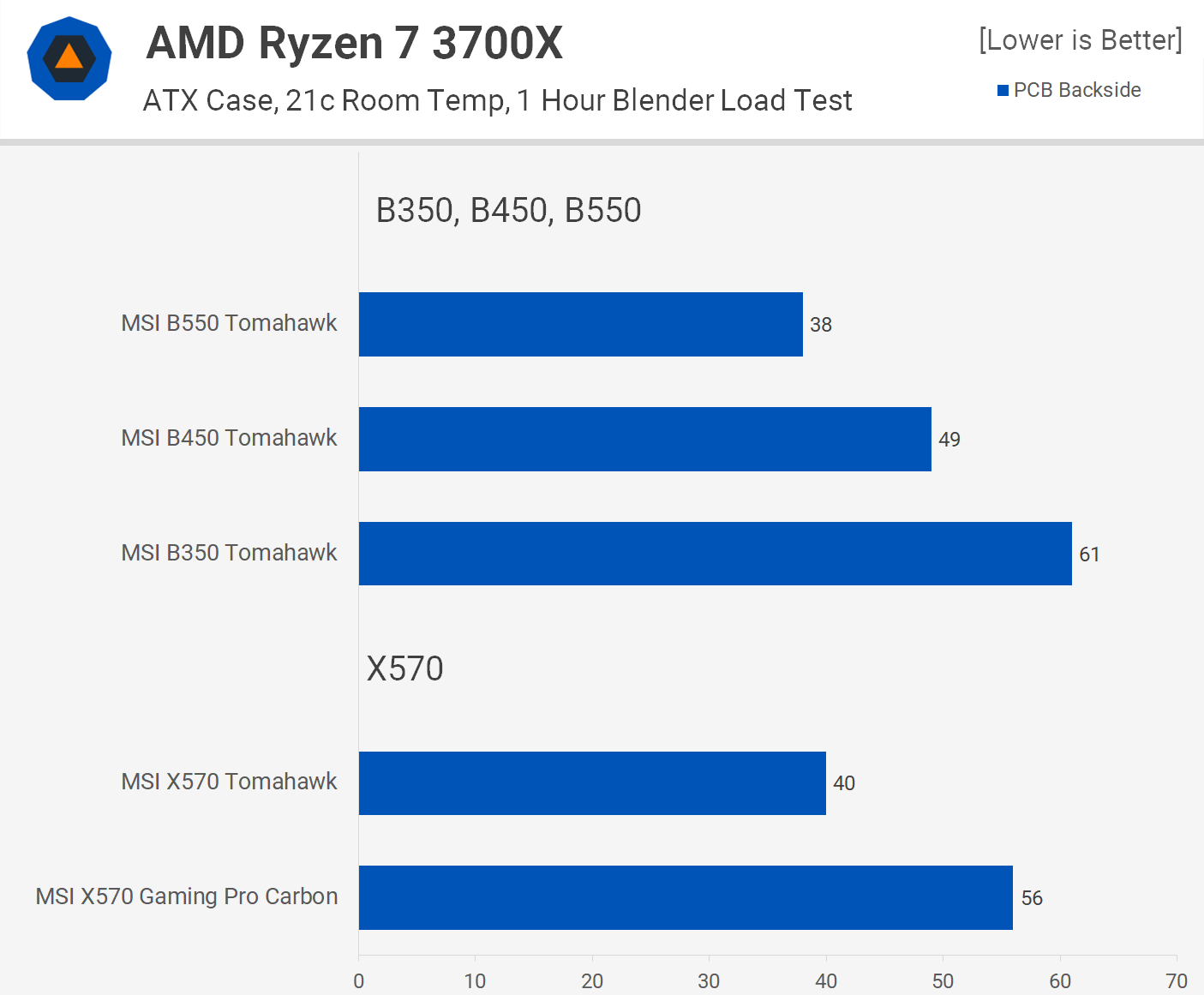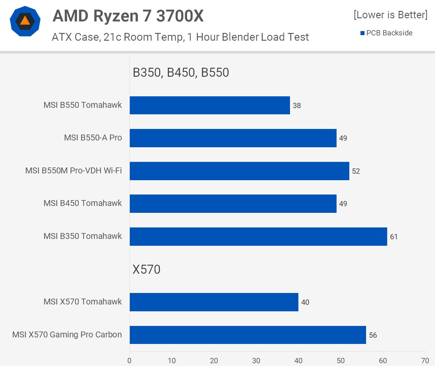 Le B550 Tomahawk est encore plus impressionnant. Alors que le modèle B450 a vu sa température augmenter de 22 degrés par rapport à la configuration 3700X, le modèle B550 n'a augmenté que de 7 degrés et était 2 ° C plus froid que le X570 Tomahawk.