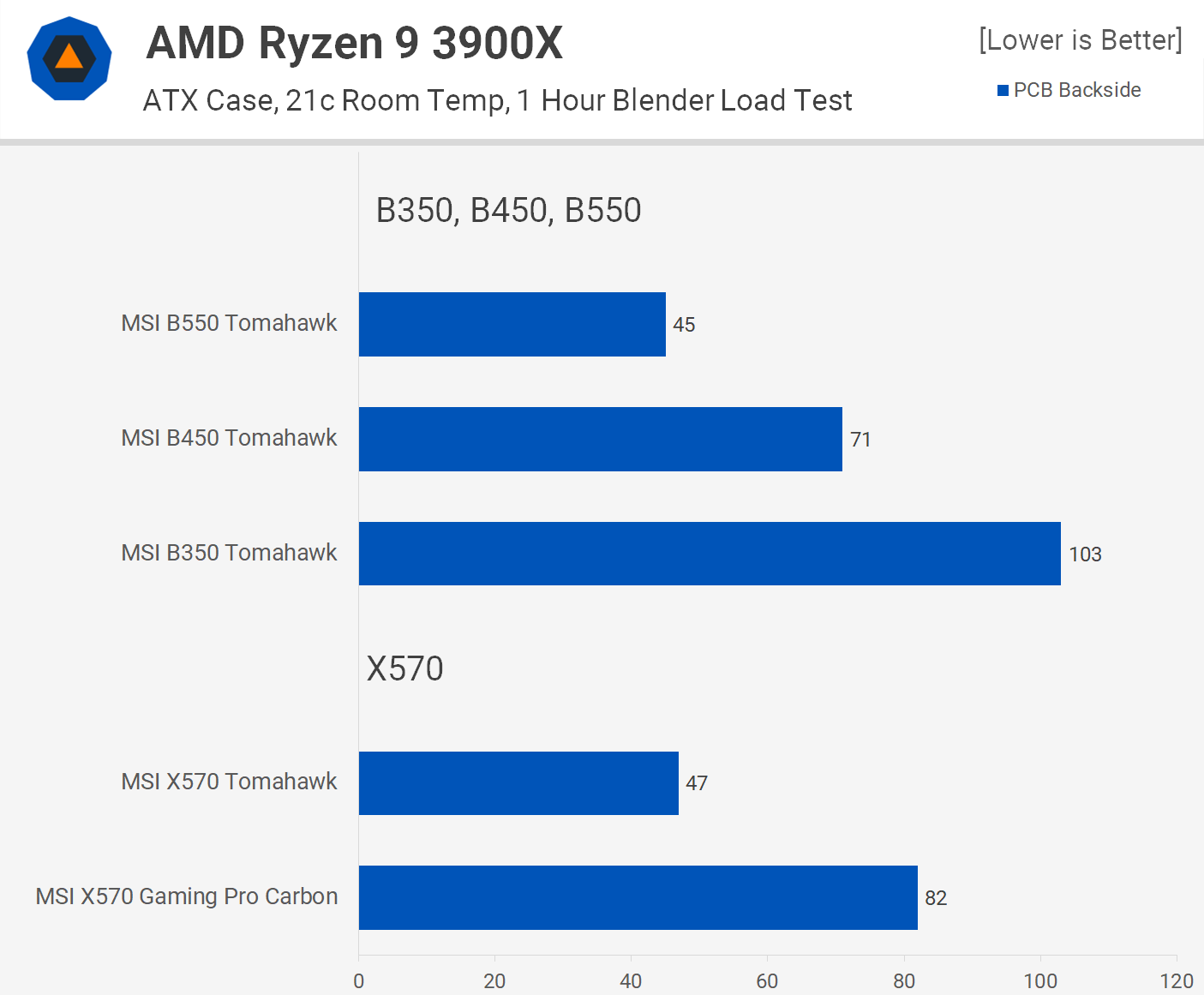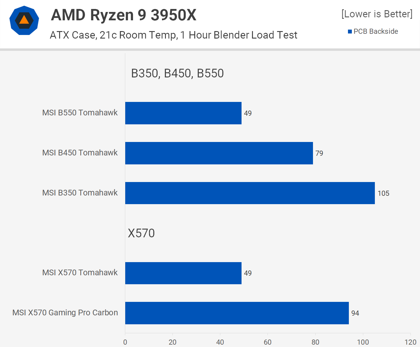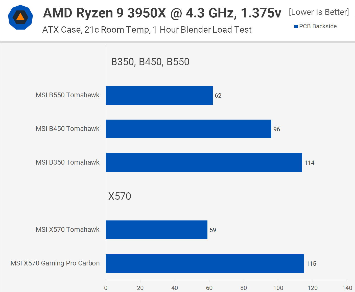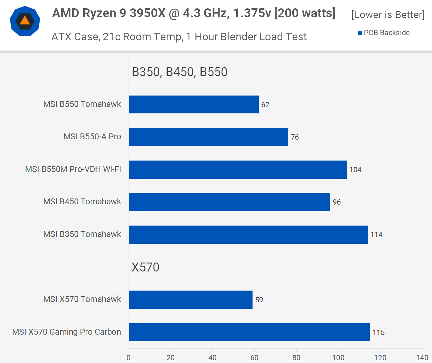 Maintenant, avec le Ryzen 9 3950X installé, la température du B550 Tomahawk VRM n'a augmenté que de 4C et le modèle B450 a connu une augmentation de 8C. Fait intéressant, le B350 Tomahawk a connu une légère augmentation et, pour autant que nous puissions en juger, il a pu éviter d'étrangler le processeur lors de notre test de résistance d'une heure.