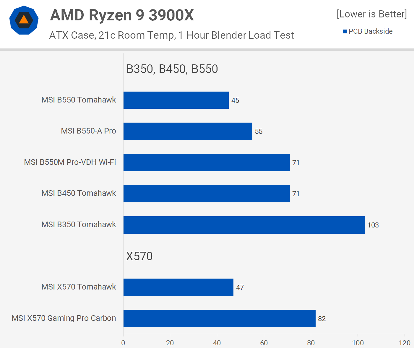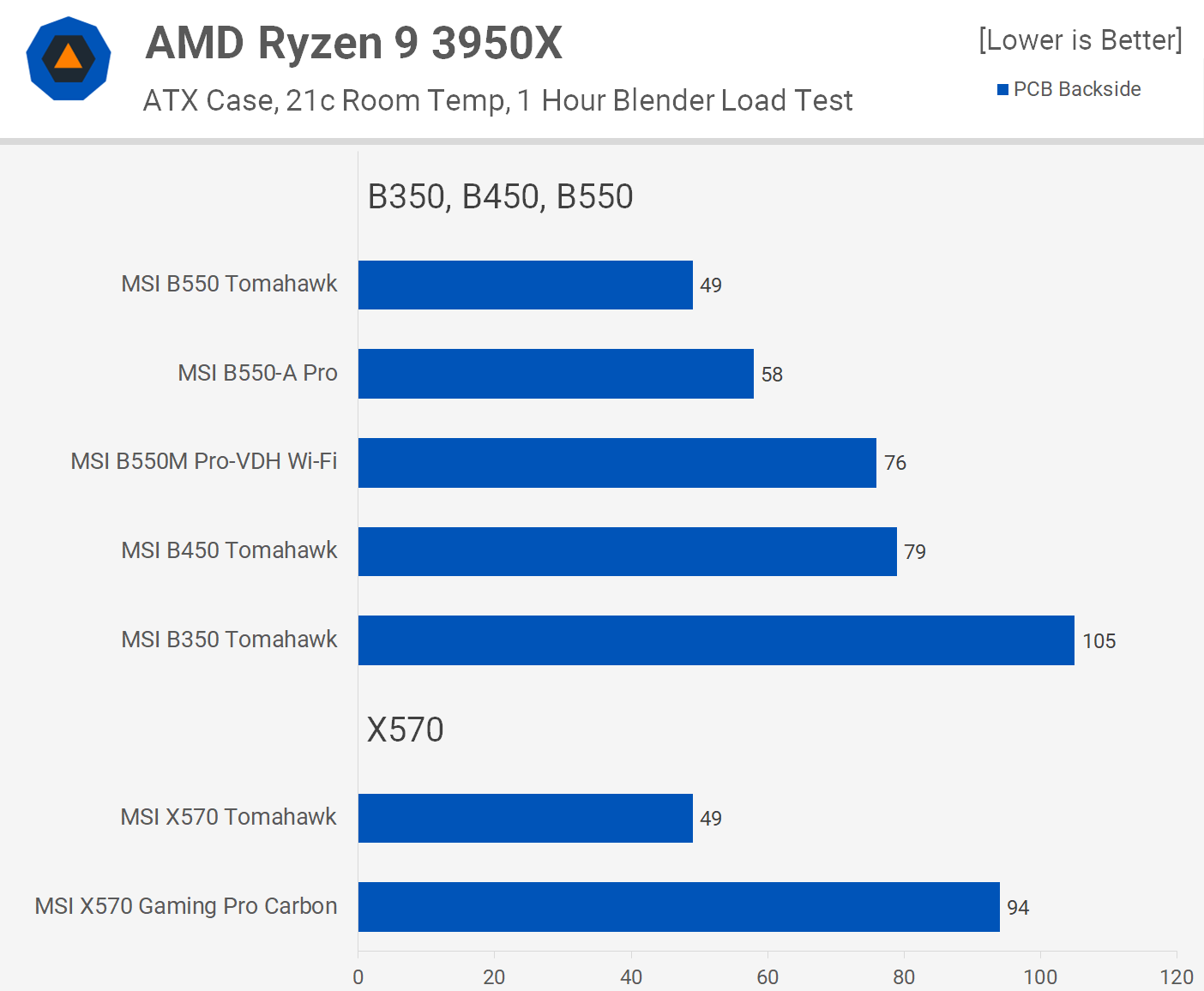 Avec le Ryzen 9 3950X installé, le Pro-VDH fonctionnait 3C plus froid que le B450 Tomahawk, tandis que le B550-A Pro était plus froid de 21C. Des résultats impressionnants pour les deux, mais particulièrement pour le B550-A Pro.
