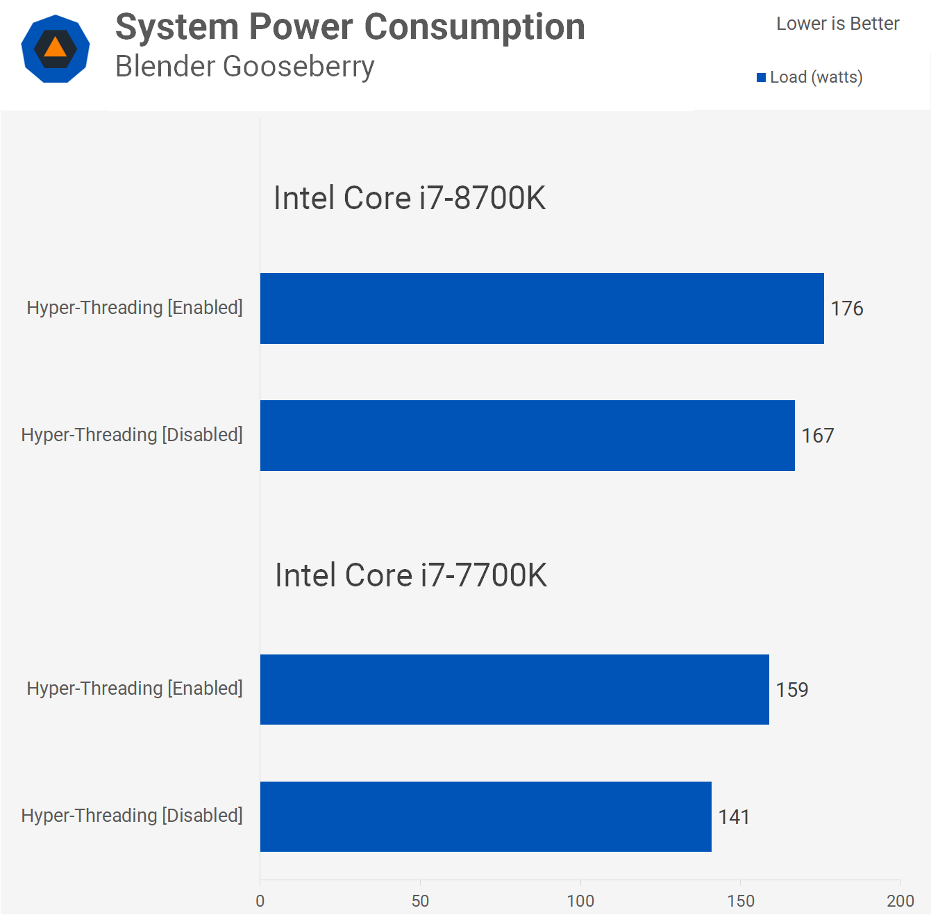 Avant de passer aux jeux, nous souhaitions noter la consommation totale d’énergie du système. Certes, nous ne prenons pas en compte la consommation individuelle des processeurs. Il est donc difficile de commenter l'efficacité, mais comme vous pouvez le constater, la désactivation de l'Hyper-Threading sur le 8700K ne nous fait pas économiser beaucoup d'énergie lors de ce test, avec une réduction d'environ 5% du système total. usage. Le 7700K était mieux exploité avec HT et nous avons constaté une réduction de 11%, ce qui correspond probablement davantage à la baisse de performances observée.