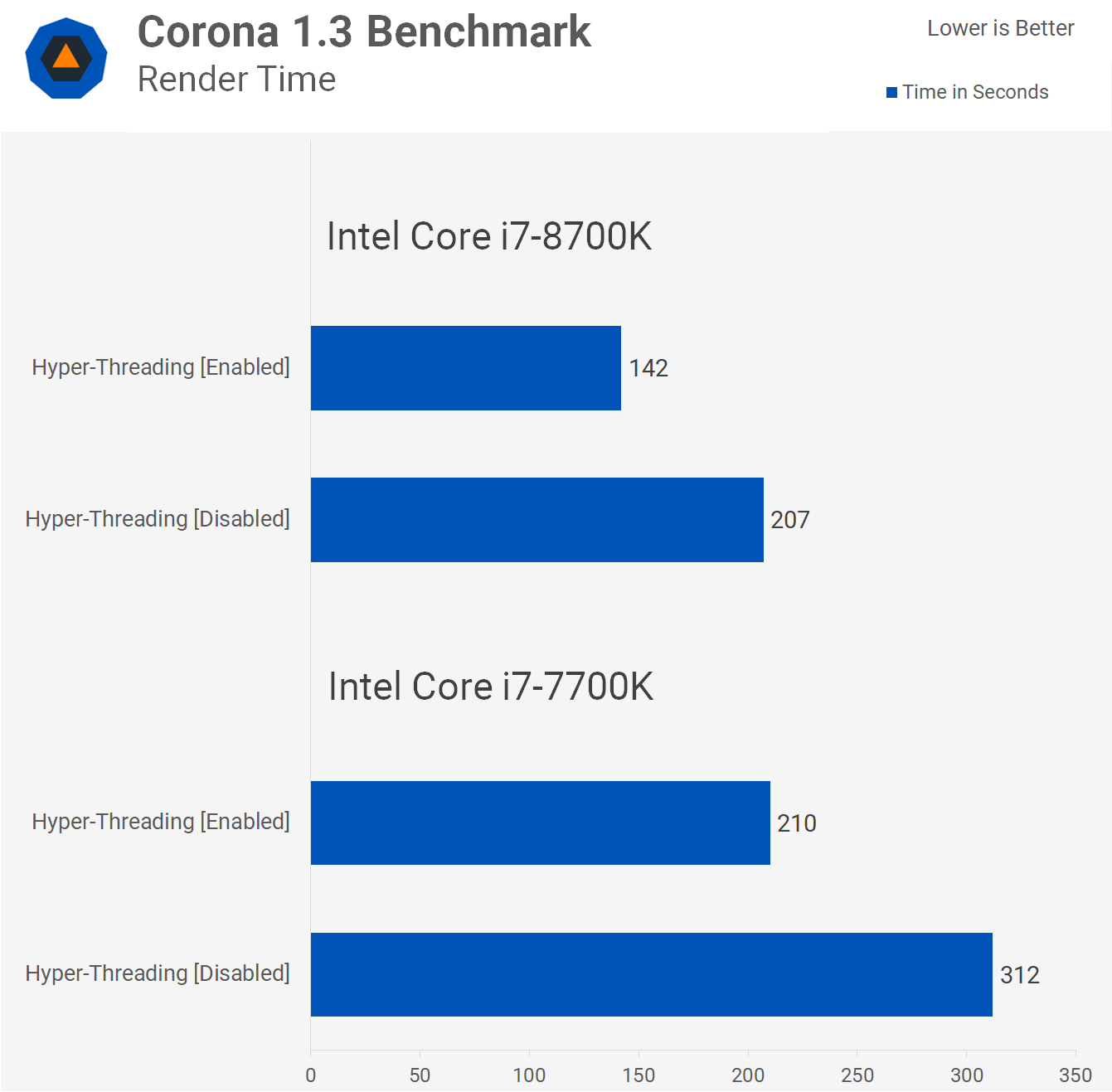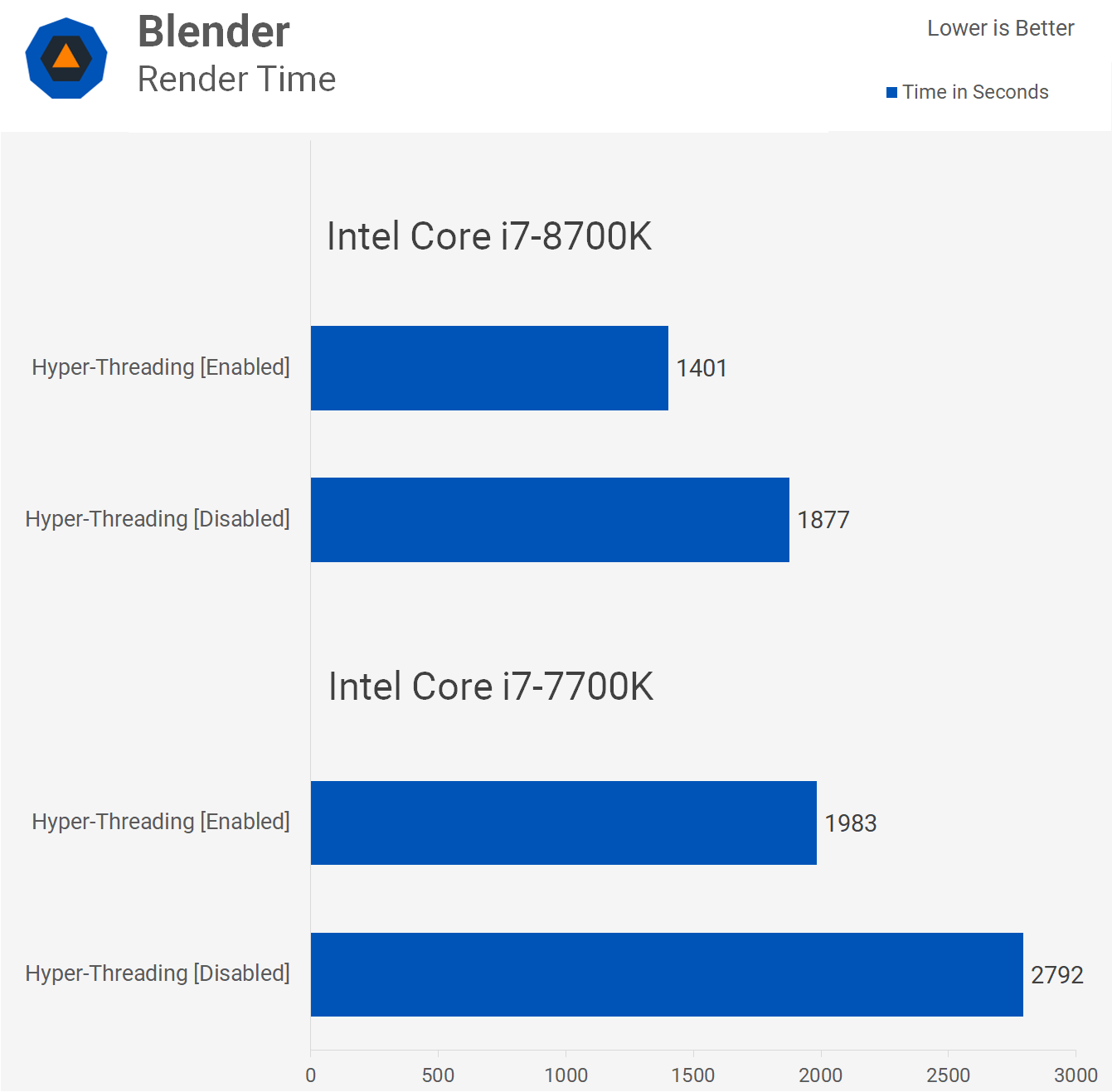 Blender connaît une baisse moins importante de 25% pour le 8700K avec Hyper-Threading désactivé, ce qui est plus proche de ce que nous avons vu sur Cinebench R20, même si cela reste important. Le 7700K avec moins de cœurs souffre un peu plus et nous constatons ici une réduction de performance de 29%.