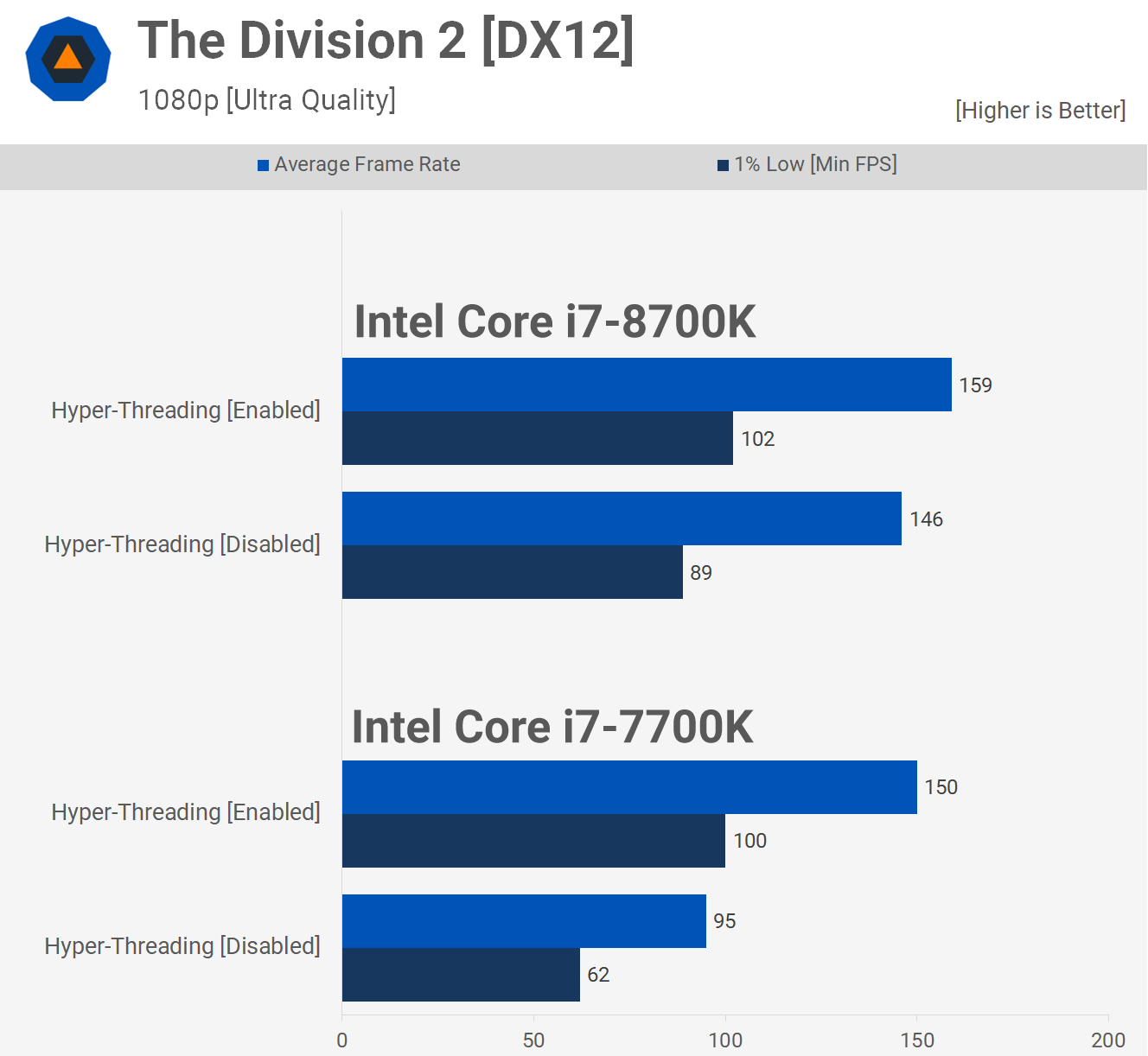 Les résultats de la division 2 sont brutaux. Observez la baisse de performances sur le 7700K avec l’hyper-threading désactivé. Le taux de trame moyen est réduit de 37% et le résultat inférieur de 1% de 38%, ce qui est proche de ce que nous avons vu sur WinRAR.