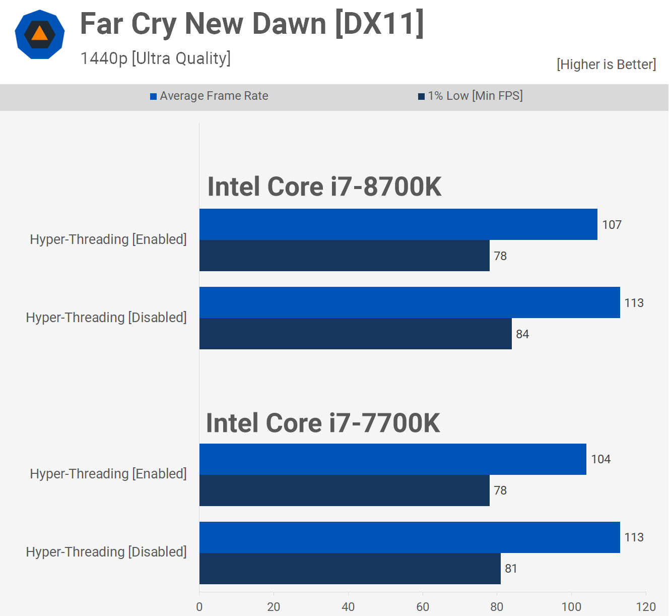 Une petite note de côté. Far Cry New Dawn joue mieux sur les 9700K que sur les 8700K. Le 9700K autorise environ 120 images par seconde en 1080p. Nous évoquons ce problème car, lorsque nous désactivons Hyper-Threading, le modèle 8700K correspond au modèle 9700K de ce test. Il est donc plus efficace d'utiliser 6-cores / 6-threads dans ce titre que le mode 6-core à 12 threads. avec des jeux lors des tests SMT.