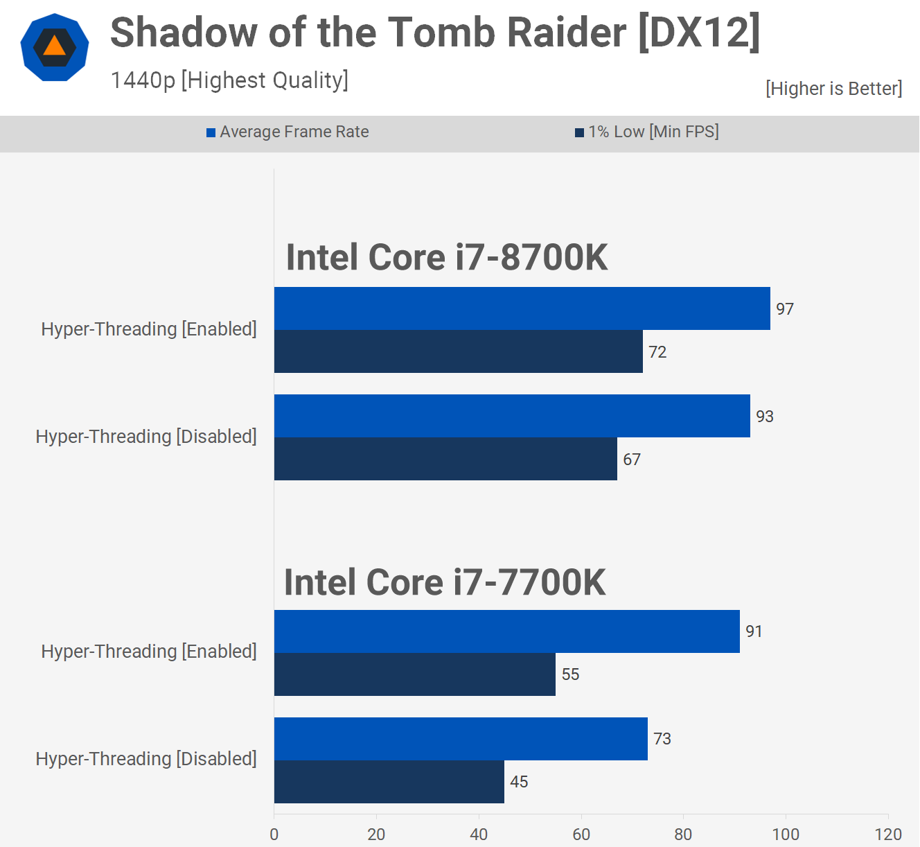 Nous avons vu à quel point Shadow of the Tomb Raider peut être exigeant et nous en avons un rappel ici. La performance du 8700K a chuté de 10 à 12% avec Hyper-Threading désactivé, tandis que celle du 7700K a baissé de 24%, bien que les marges basses de 1% soient similaires à celles observées avec le 8700K. Dans les deux cas, la désactivation de SMT a un impact important dans ce titre.