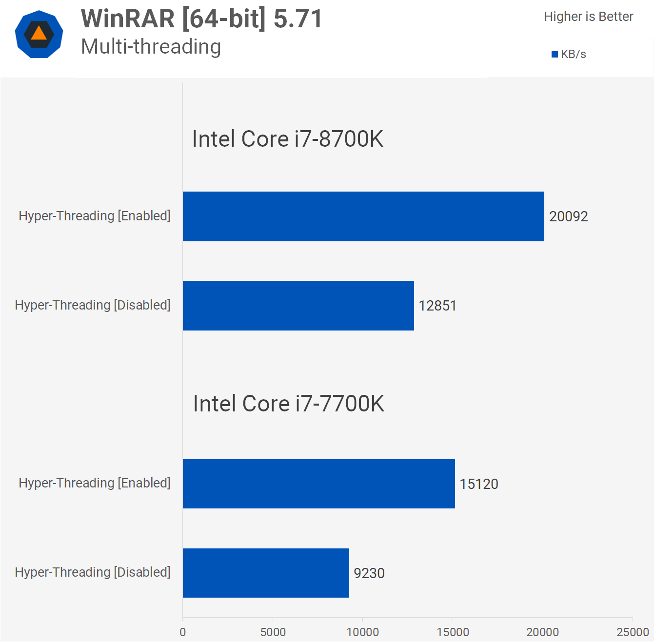 WinRAR voit une réduction massive de 36% du débit du 8700K. Clairement, l'hyper-threading fonctionne très bien pour ce type de charge de travail. De même, nous constatons une chute massive du 7700K, soit une réduction de 39% dans ce cas.