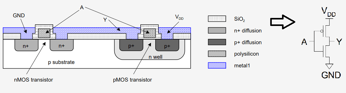 La structure physique d'un onduleur en silicium. Chaque région colorée a des propriétés de conductivité différentes. Notez comment les différents composants de silicium correspondent au schéma de droite