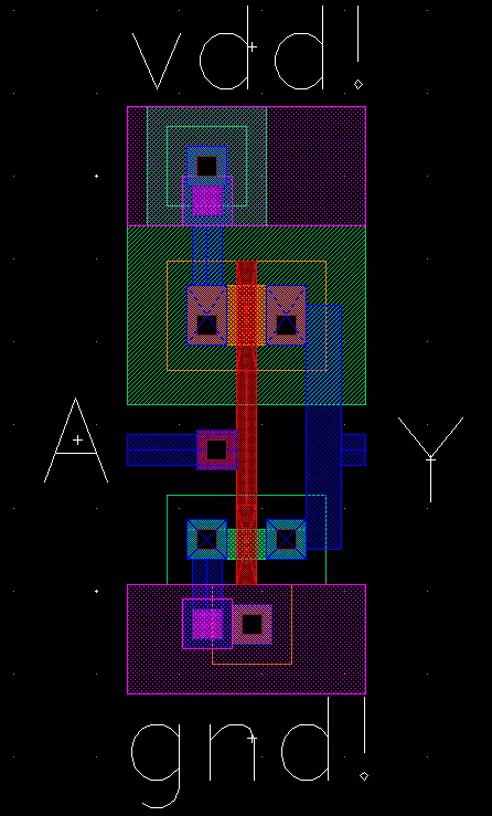 Nous voyons d’abord la structure d’un onduleur qui est une cellule standard. Le rectangle vert barré en haut est le transistor pMOS et le rectangle vert transparent en bas est le transistor nMOS. Le fil rouge vertical correspond à la porte en silicium polycristallin, les zones bleues au métal 1 et les régions mauves au métal 2. L'entrée A entre à gauche et la sortie Y à droite. Les connexions d’alimentation et de mise à la terre sont effectuées en haut et en bas sur le métal 2.