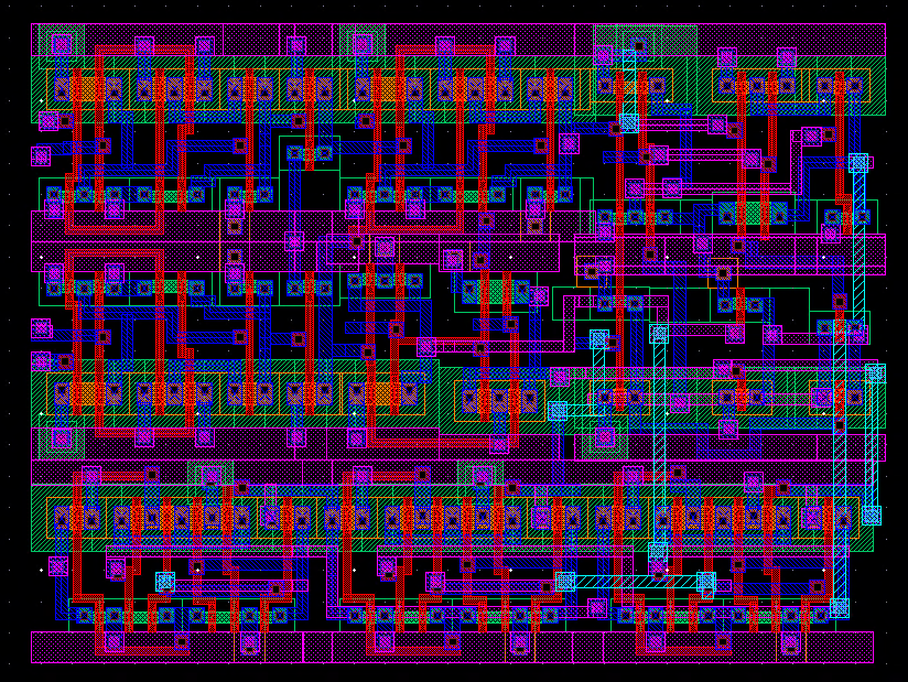 En combinant plusieurs portes, nous avons ici une unité arithmétique à 1 bit de base. Cette conception peut ajouter, soustraire et effectuer des opérations logiques sur deux entrées de 1 bit. Les fils bleus barrés qui vont verticalement sont en métal à 3 couches. Les carrés légèrement plus grands aux extrémités des fils sont des vias qui connectent deux couches.