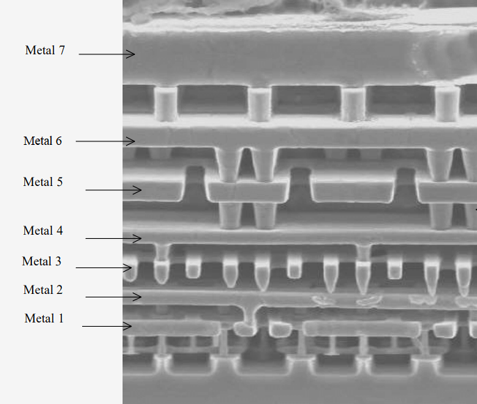 L'image du microscope ci-dessous montre le réseau formé par sept couches métalliques. Chaque couche est plate et à mesure qu'elle monte, les couches grossissent pour aider à réduire la résistance. Entre chaque couche se trouvent de petits cylindres métalliques appelés vias utilisés pour sauter d'une couche supérieure. Chaque couche alterne généralement dans le sens opposé de celle située en dessous pour aider à réduire les capacités indésirables. Les couches métalliques impaires peuvent être utilisées pour établir des connexions horizontales, tandis que les couches paires peuvent être utilisées pour établir des connexions verticales.