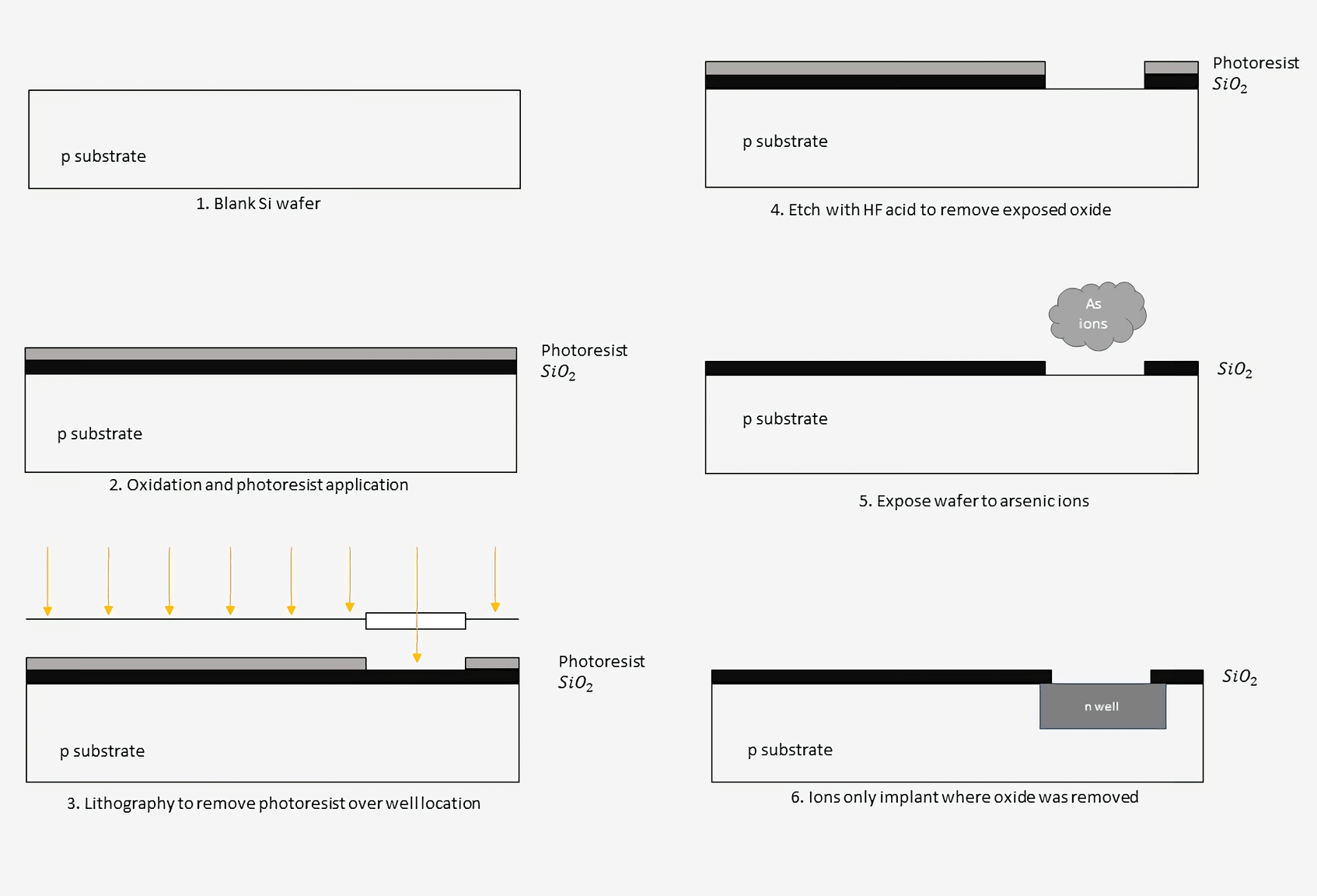 La plaquette est attaquée avec de l'acide fluorhydrique pour dissoudre le dioxyde de silicium là où le photorésist a été éliminé. La résine photosensible est ensuite retirée, ne laissant que la couche d'oxyde en dessous. Les ions dopants peuvent ensuite être appliqués sur la tranche et ne s’implanteront que s’il existe des lacunes dans l’oxyde.