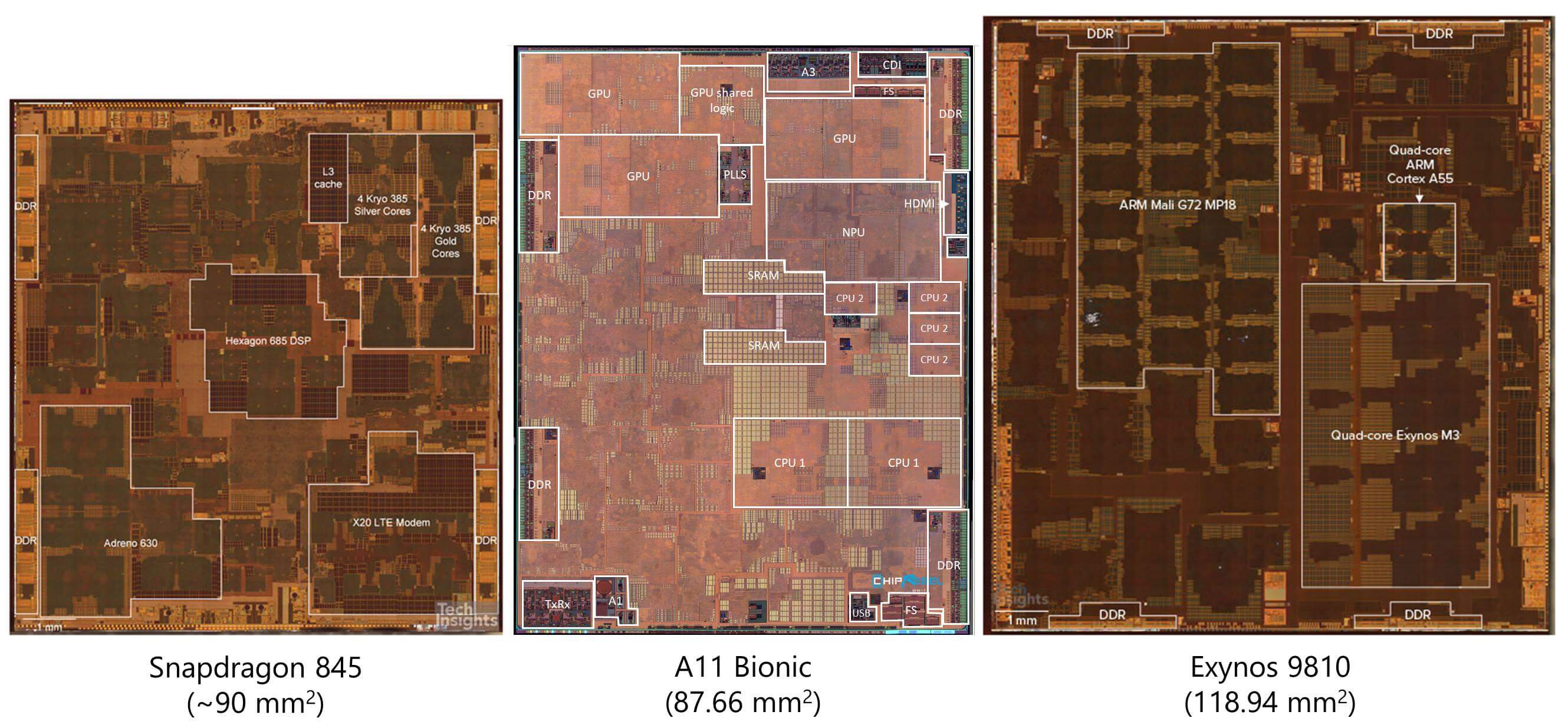 Coups de poing montrant la composition de plusieurs processeurs mobiles courants