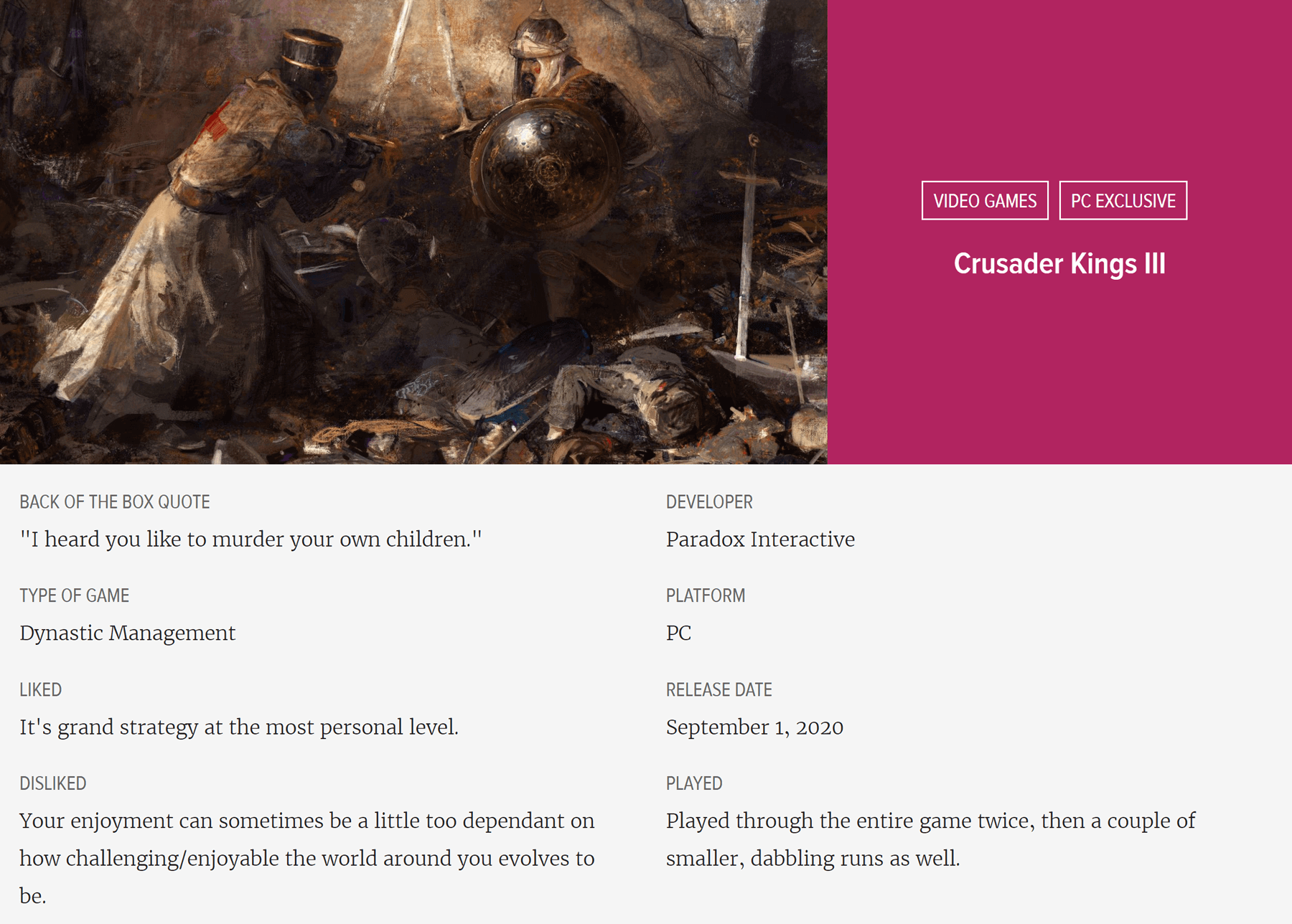 Crusader Kings III est la suite directe de 2012 Crusader Kings II, que j’ai nominé pour le jeu de l’année de Kotaku à l’époque, puis pendant environ cinq ans par la suite. À première vue, c'était juste un autre grand jeu de stratégie Paradox Interactive, comme Coeurs de fer ou Europa Universalis, quelque chose de terriblement niche et avec tous les boutons et menus et la complexité abstraite que cela impliquait.