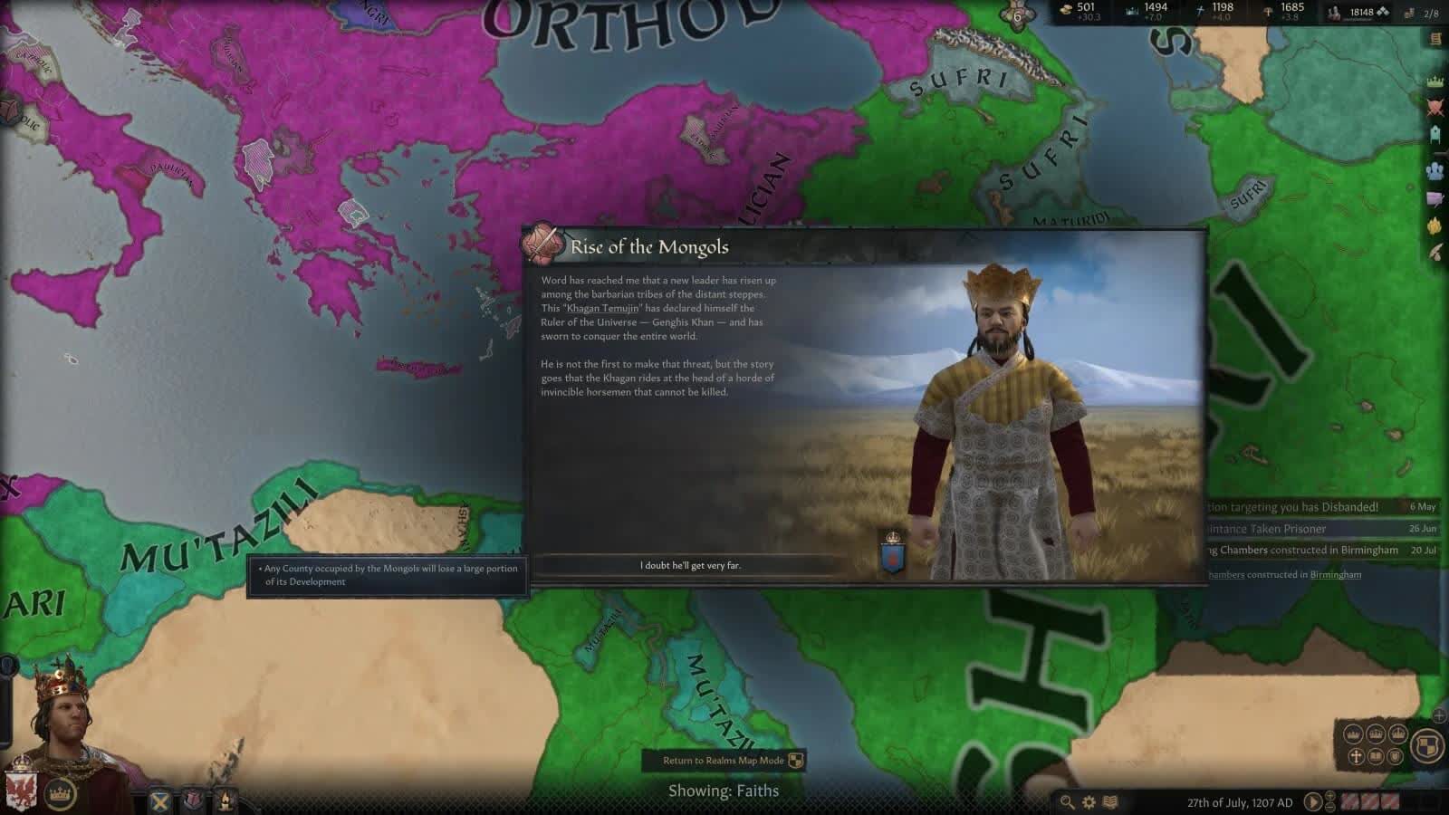 En tant que dirigeant, je peux (nous y voilà, je vous énumère à nouveau) élever puis diriger personnellement des armées autour de la carte. Je peux plonger dans les relations que j'ai avec tous mes vassaux, m'évanouir sur certains, dîner avec d'autres et emprisonner les vrais fauteurs de troubles. Je peux créer une toute nouvelle religion, de ses principes à son iconographie, et ceux-ci peuvent avoir d'énormes effets d'entraînement sur mon expérience de jeu, sans parler du fait que mes traits de caractère (ou ceux de ma famille) sont considérés comme des vertus ou des péchés.