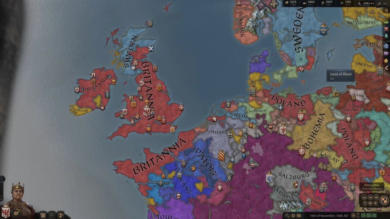 Crusader Kings III C'est une énorme amélioration à cet égard, principalement parce qu'il a utilisé ce qui est essentiellement les mêmes systèmes (et même des boutons) et a simplement tout organisé de manière beaucoup plus propre et intuitive. Les choses que vous devez savoir pour le moment sont affichées en conséquence, les boutons dont vous avez besoin pour vous rendre aux endroits les plus importants sont grands et colorés, et tout ce qui vous concerne personnellement est accessible par … un portrait géant de vous-même. Cela aide également que les menus soient maintenant très agréables et modernes, très Civilisation avec leurs arrière-plans bleus et leur texte doré.