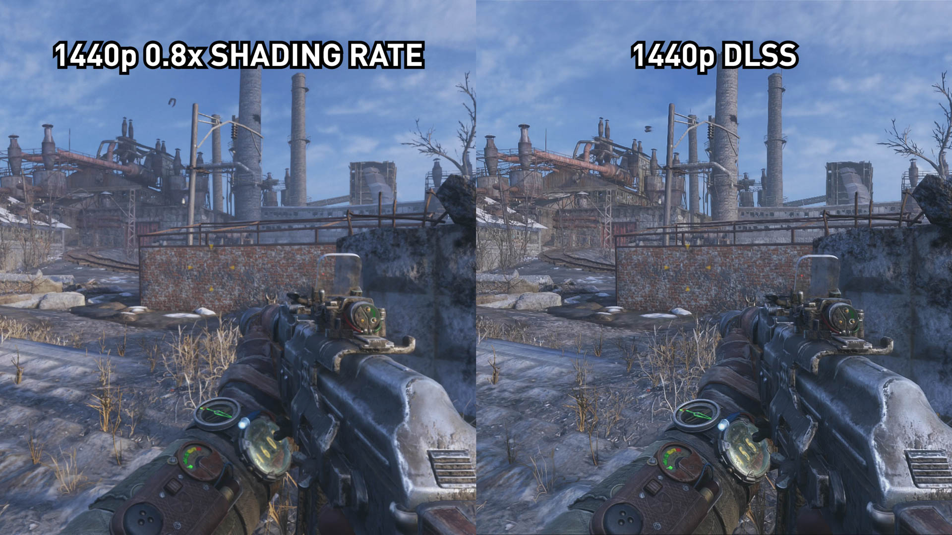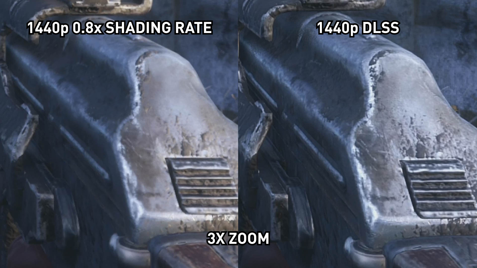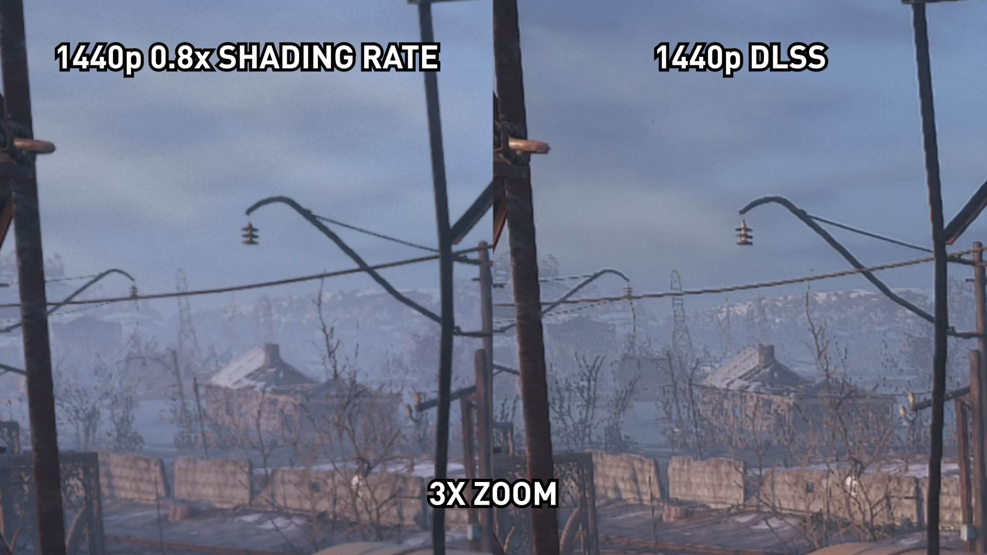 À 1440p, nous estimons que les différences entre DLSS et un taux d’ombrage de 0,8x sont encore plus prononcées qu’elles ne l’étaient à 4K, mais peut-être pas de la manière que vous attendez. Les zones où DLSS est supérieur au sous-échantillonnage deviennent encore plus apparentes à une résolution inférieure: les arbres sont plus lisses et l'image est nettement plus nette dans certaines zones.
