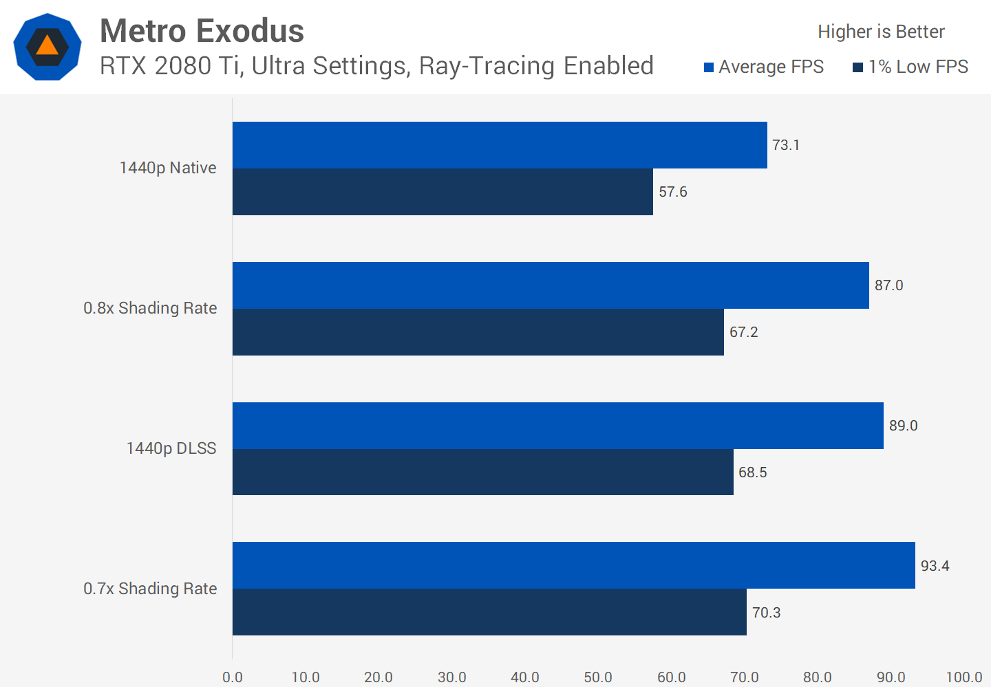 Alors que nos données 1800p ici proviennent d’une résolution personnalisée de 1800p, Metro Exodus inclut également une option de taux d’ombrage. La performance la plus proche de 1800p dans les performances et les visuels est un taux d'ombrage de 0,7x. D'après ce que nous avons constaté, l'option de taux d'ombrage 0,7x est un peu moins bonne que le 1800p approprié, tout en semblant légèrement pire. Les trois options de sous-échantillonnage offrent une amélioration d'environ 21% des performances par rapport au rendu natif.