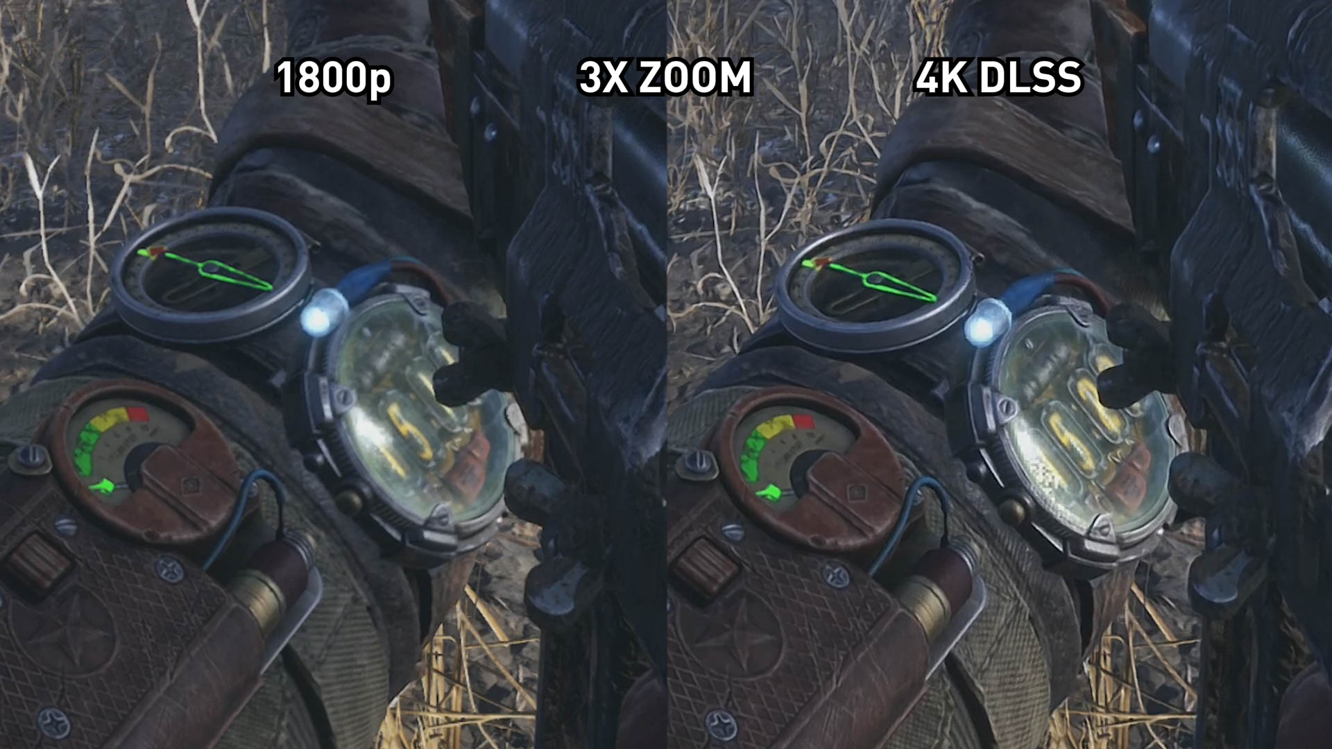 Il existe certains domaines où DLSS est plus nette et présente une image supérieure. La plupart du temps, il s’agit d’éléments statiques, comme la montre au poignet de votre personnage et le menu principal. Ces zones ne changent pas beaucoup en fonction de votre position, et c’est là que le DLSS a un avantage.