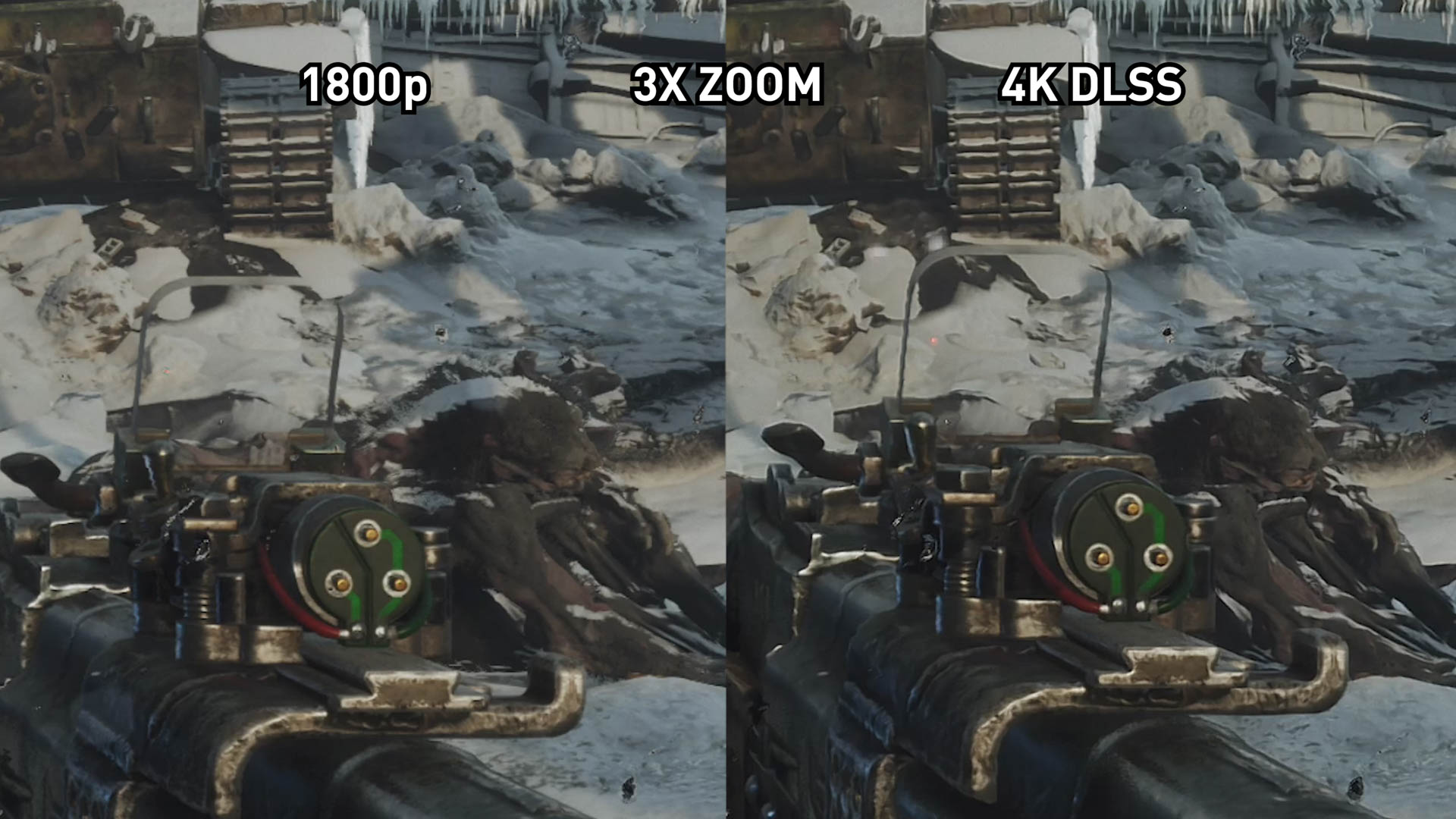 Après avoir examiné de près un grand nombre de séquences DLSS, nous avons eu l’impression qu’un filtre de netteté et de réduction du bruit après traitement est utilisé. Nous n’avons aucune idée du processus de développement de Metro Exodus, mais nous soupçonnons le récent correctif selon lequel le DLSS «corrigé» a simplement mis en place un filtre de netteté pour supprimer le flou qui a affecté la première version. Vous pouvez repérer un halo autour des objets, ce qu'un artefact peut rendre accentué, tandis que l’augmentation des reflets chatoyants et des bavures de texture sont également des sous-produits typiques des techniques de post-traitement comme l’aiguisement et la réduction du bruit.