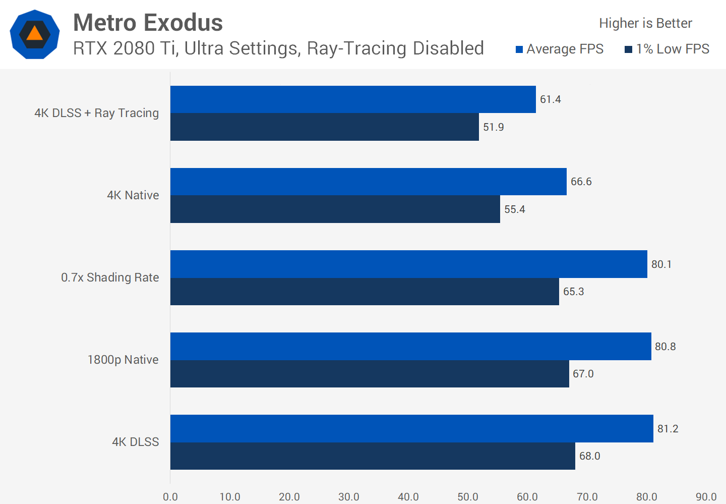 Quant à Metro Exodus, il s’agit de la meilleure implémentation de DLSS que nous ayons vue et c’est une fonctionnalité qui plaira aux propriétaires de GeForce RTX. Même si les développeurs ont dû recourir à des effets de post-traitement pour améliorer la qualité d'image, les résultats sont tout à fait respectables et correspondent davantage à ce que nous attendions de DLSS dans les jeux réels. Mais si vous avez un GPU Pascal, un GPU Maxwell ou quelque chose d’AMD, nous ne penserons pas que vous êtes en train de le manquer, car c’est bien, mais ce n’est rien de spécial.