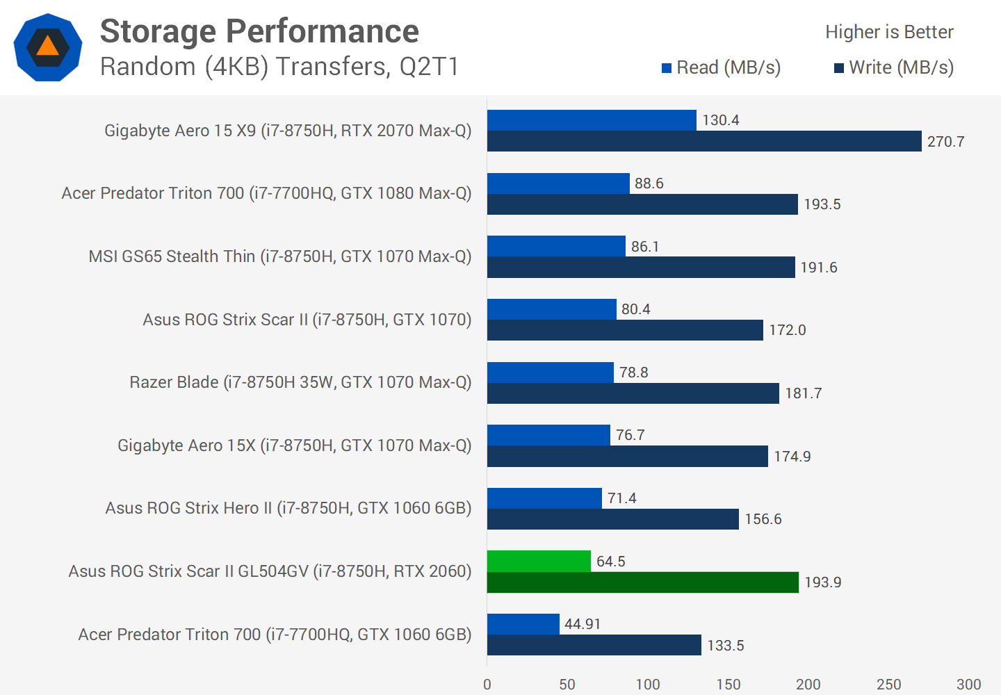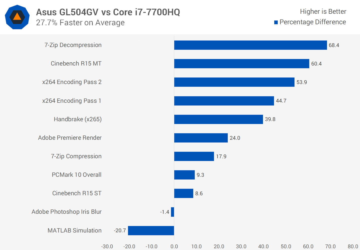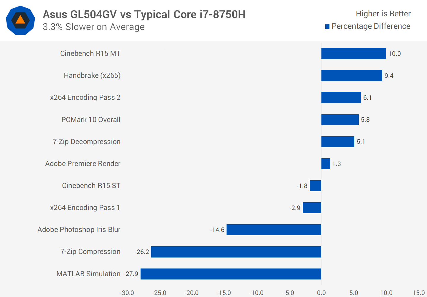 Les performances du Asus ROG GL504GV sont à peu près équivalentes à celles d’un ordinateur portable Core i7-8750H typique, mais il n’ya que quelques différences notables qui favorisent et désavantagent le système. En raison du mode Turbo Fan, les charges de travail plus longues ont tendance à freiner moins que les performances standard du 8750H. Nous constatons donc un avantage pouvant atteindre 10% pour les charges de travail multi-thread plus longues, telles que Handbrake. Cet ordinateur portable peut supporter des horloges plus élevées plus longtemps. D'un autre côté, en raison de la mémoire à canal unique, cet ordinateur portable obtient des notes plus basses dans nos tests de mémoire lourds. Cela inclut la compression 7-Zip, MATLAB et Adobe Photoshop Iris Blur.
