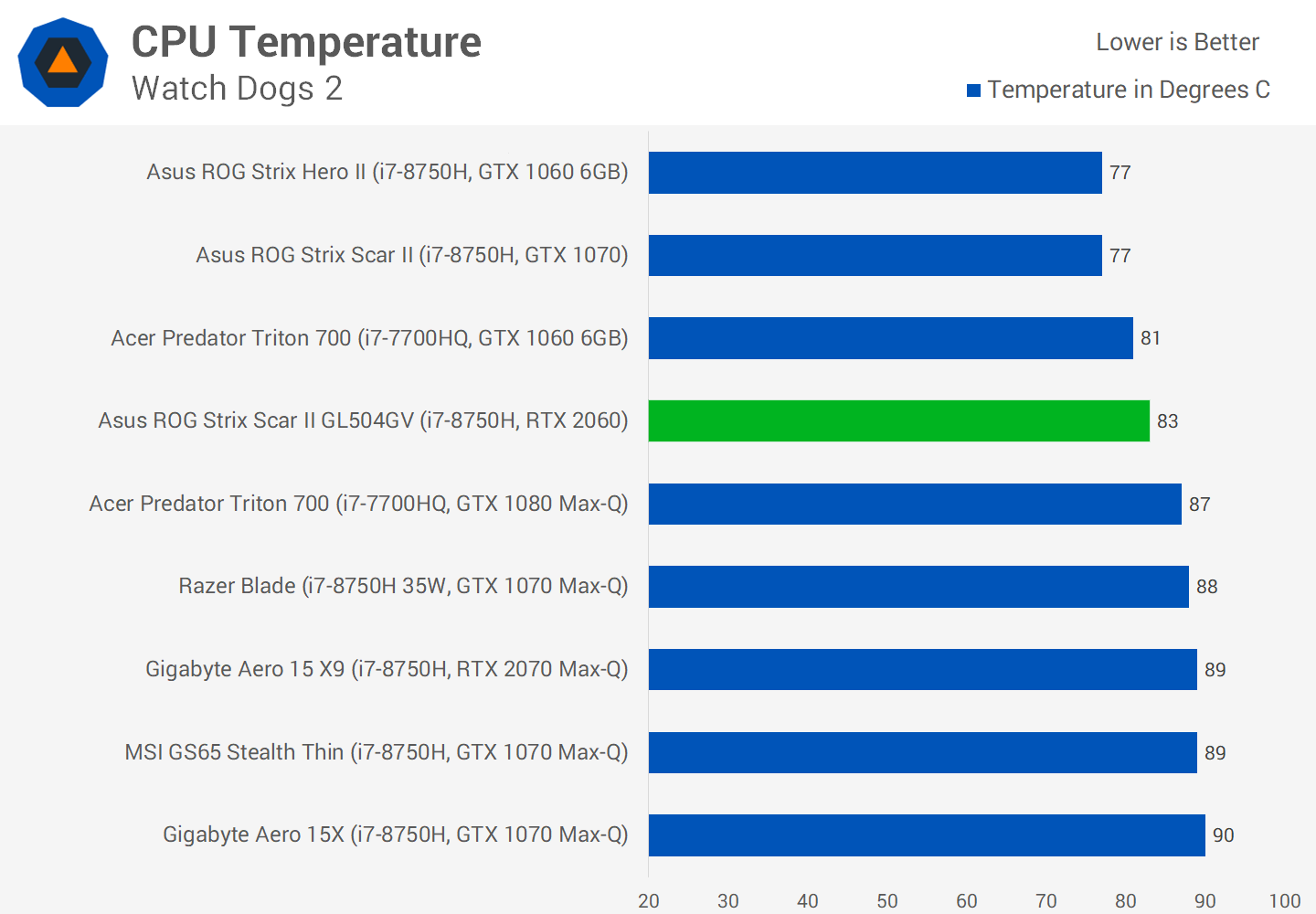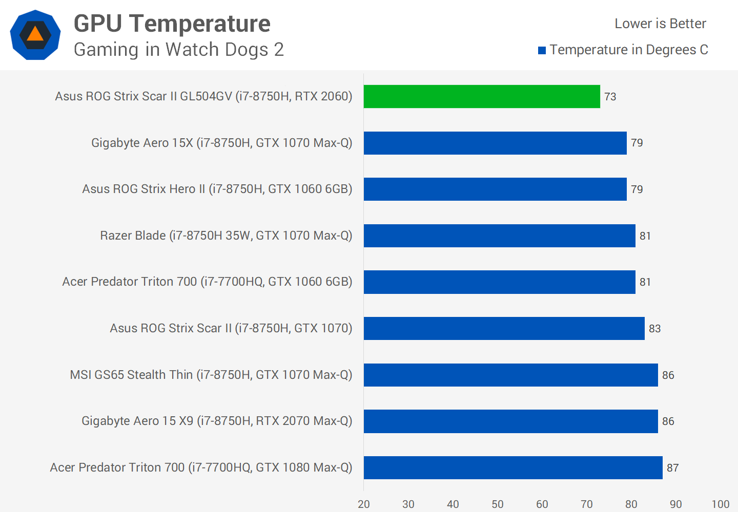 Cependant, les températures sont très bonnes, ce qui indique que le mode équilibré accélère peut-être trop le ventilateur. Nous avons enregistré à peine 73 degrés sur le processeur graphique et 83 degrés sur le processeur lors d'une session Watch Dogs 2 étendue, ce qui est bien inférieur à celui d'autres ordinateurs portables dotés de sorties de bruit similaires. Nous pensons qu'un réglage manuel des ventilateurs contribuerait grandement à équilibrer les températures et le bruit.