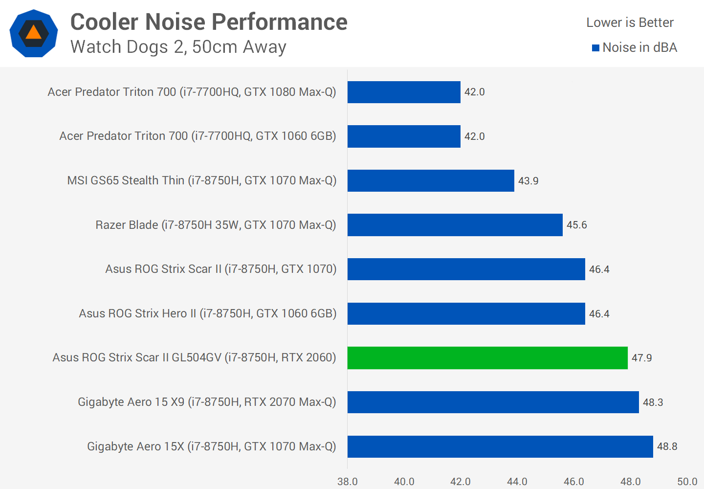 En regardant la solution de refroidissement utilisée dans le ROG Strix Scar II et en utilisant le mode ventilateur équilibré pour les jeux offrant les performances que vous avez vues jusqu'à présent, le refroidisseur est assez bruyant sous la charge, augmentant de près de 48 dBA lors de nos tests. Il a également tendance à monter et descendre un peu pendant que vous jouez, de sorte que parfois le refroidisseur est plus silencieux que ce chiffre, mais pour être honnête, les changements fréquents sont tout aussi gênants que de fonctionner à 48 dBA tout le temps.