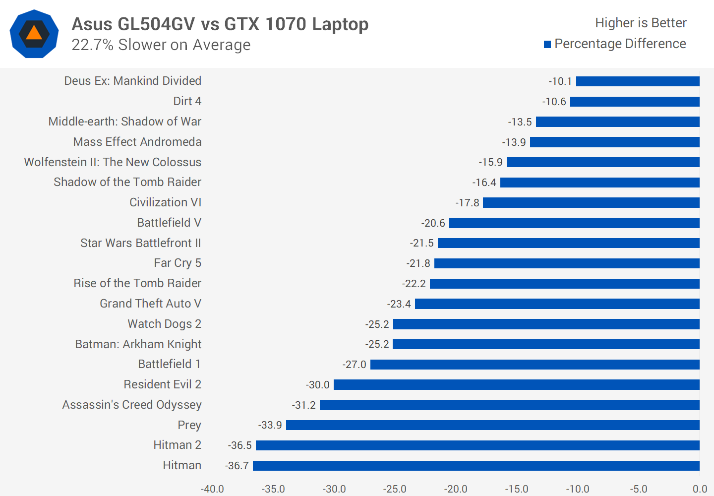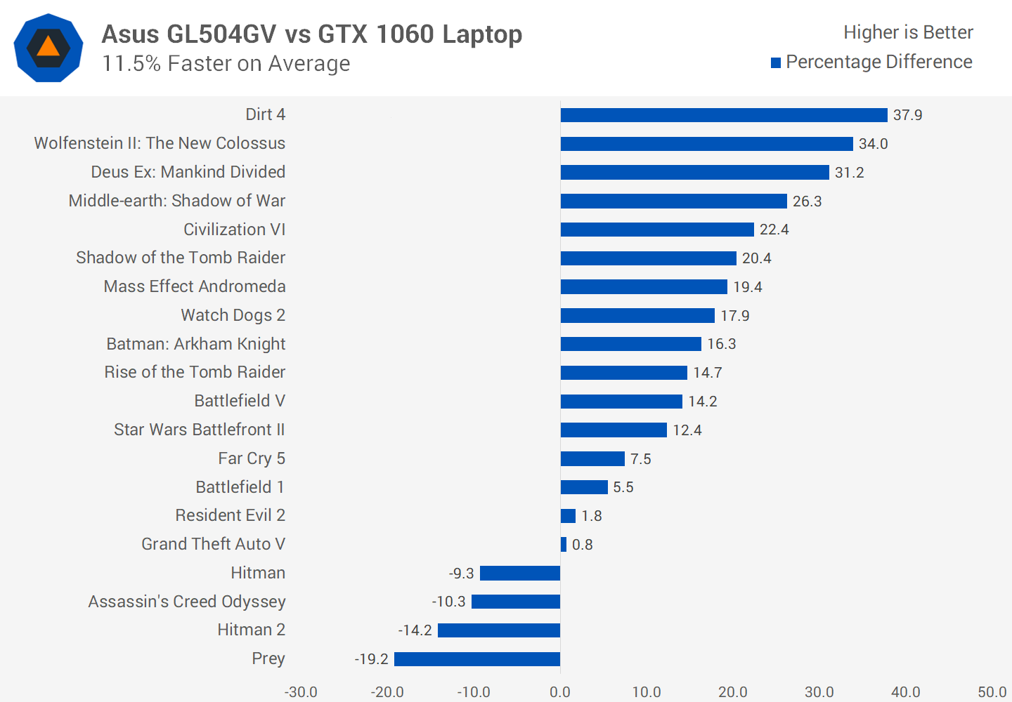 Cela a également un impact sur les marges entre cet ordinateur portable RTX 2060 et les autres GPU. En comparant le mode dual-channel au dual-channel, le RTX 2060 est environ 28% plus rapide en moyenne qu’une GTX 1060 6 Go. Mais cet ordinateur portable à canal unique RTX 2060, comparé à un système à double canal GTX 1060 6 Go, n’est que de 12% plus rapide et est en fait plus lent dans certains jeux. Puis, comparé à quelque chose avec une GTX 1070 à l’intérieur avec une RAM double canal, il perd de plus de 20%.