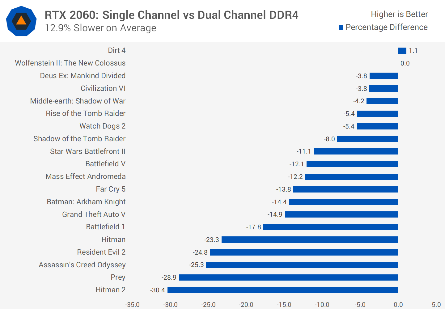 En termes d’impact FPS réel, dans un jeu comme Hitman 2, on parle de passer de 70 FPS en moyenne à 50 FPS avec une mémoire monocanal (!!!). Dans Assassin’s Creed Odyssey, une expérience de 60 FPS est réduite à seulement 45 FPS. Ce n’est pas une bonne perte de performance.