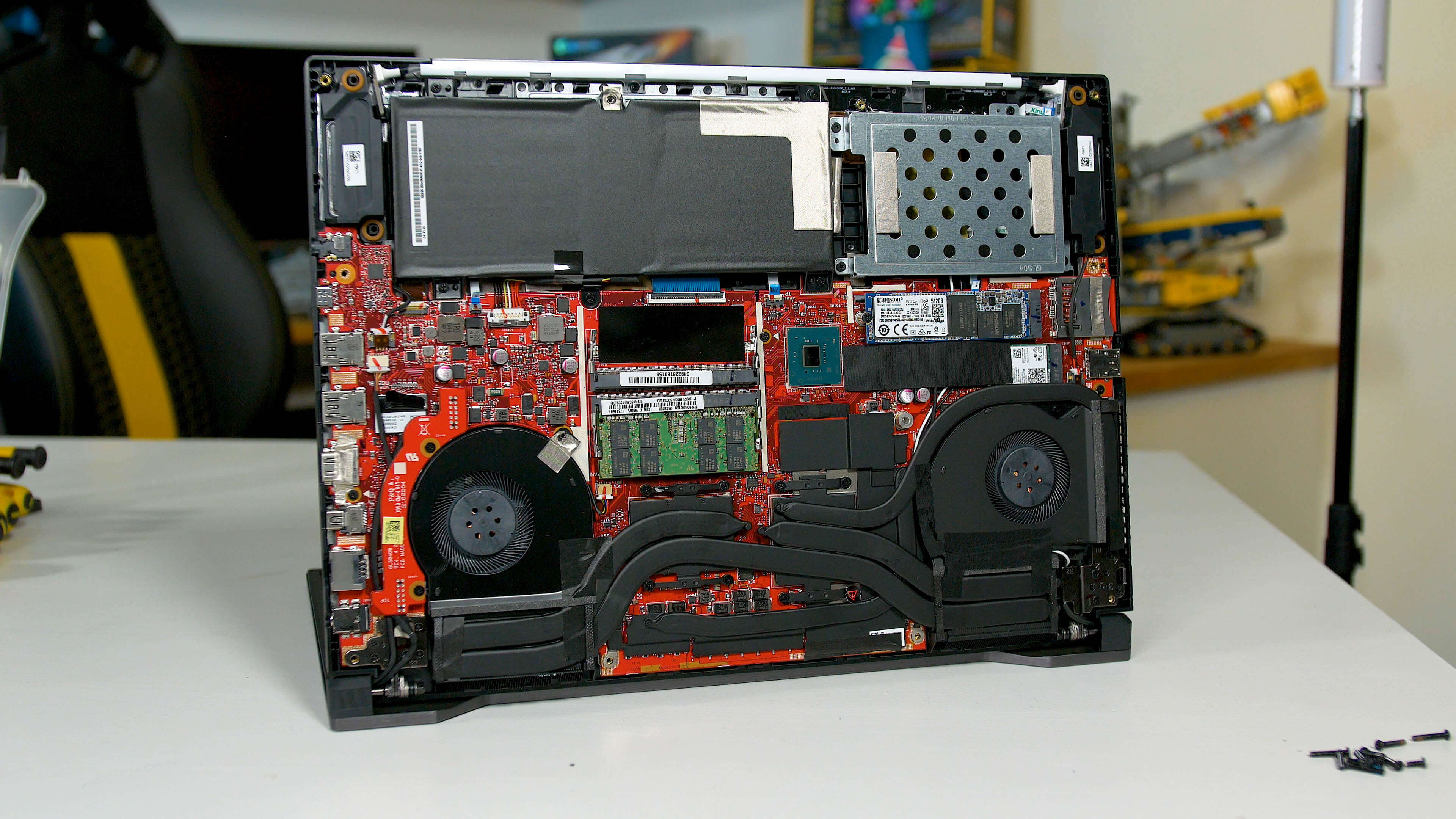 Pour le stockage, nous avons reçu un SSD Kingston M.2 PCIe NVMe de 512 Go. Il s’agit d’un outil de taille moyenne, pas aussi rapide que certains disques SSD Samsung ou Intel que nous avons déjà vu sur d’autres ordinateurs portables de jeu, mais suffisamment rapide pour offrir un avantage en termes de performances par rapport aux disques SSD SATA de base. En interne, il existe également une baie de lecteur libre de 2,5 pouces pour plus de stockage.