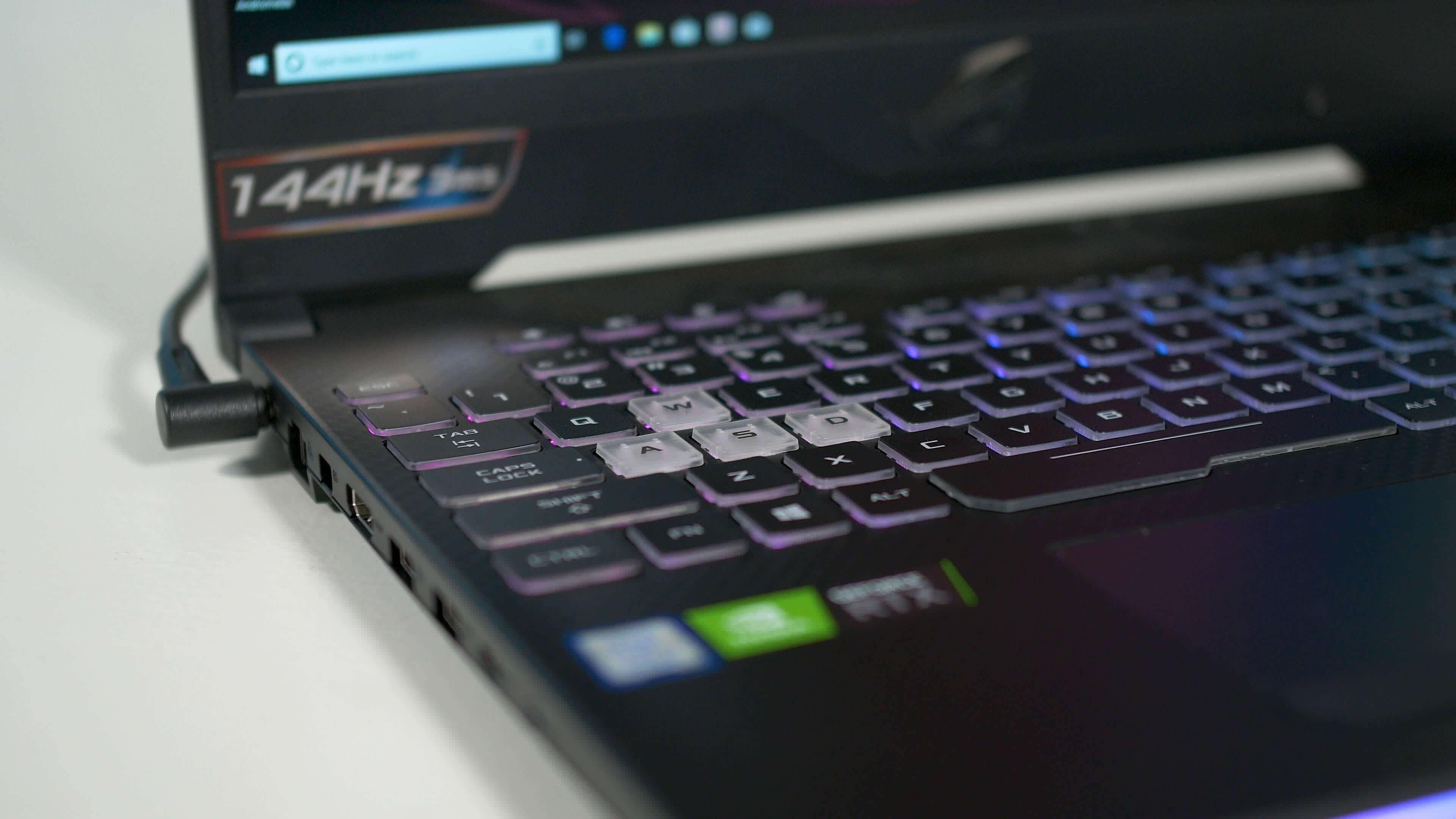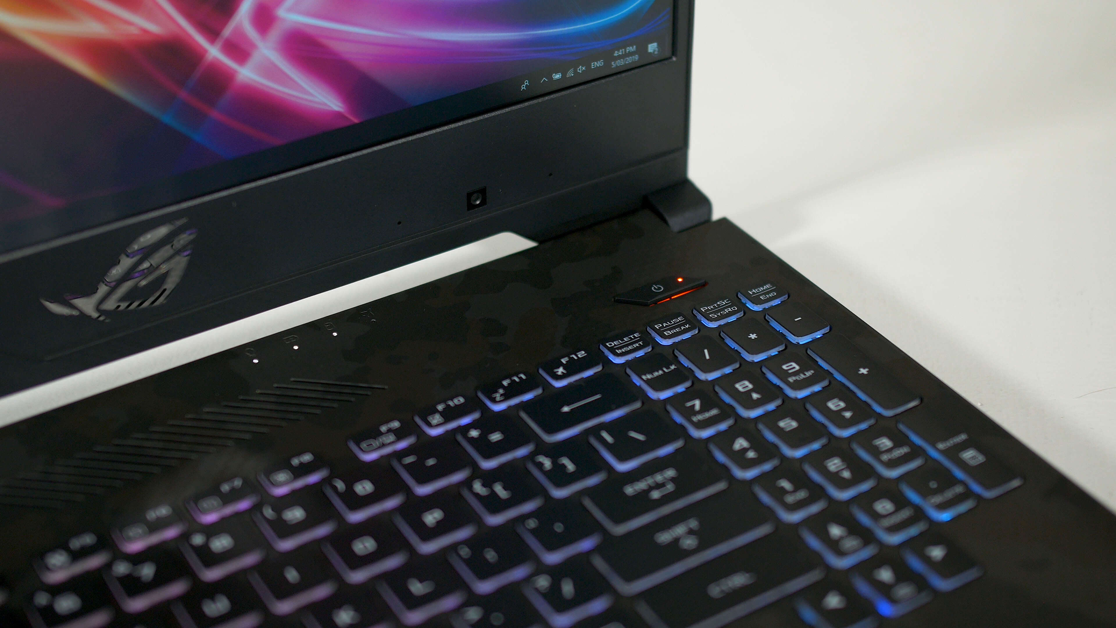 Oui, il y a aussi le RVB. Vous obtenez une bande sur le bord avant de l'ordinateur portable, ainsi que le logo Asus ROG excentré sur le couvercle, tous deux contrôlables à l'aide du logiciel Asus ’Aura. La bande RVB avant est directement liée au rétroéclairage du clavier RVB à quatre zones. Vous ne pouvez pas obtenir de RVB par clé ici, mais l’effet de base à quatre zones est assez agréable. Le clavier a un peu une réponse tactile spongieuse, il n'est pas aussi cliqué que je le préférerais, mais la distance de déplacement est convenable, en plus vous obtenez un pavé numérique et aucune des touches n'est tronquée pour s'adapter à cela. Le trackpad est génial et nous aime l'inclusion de deux boutons de clic distincts.