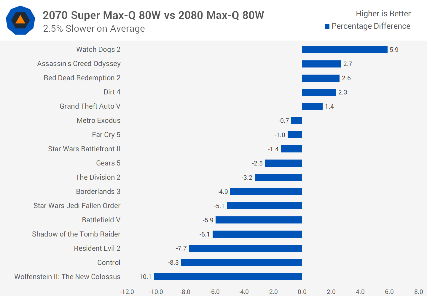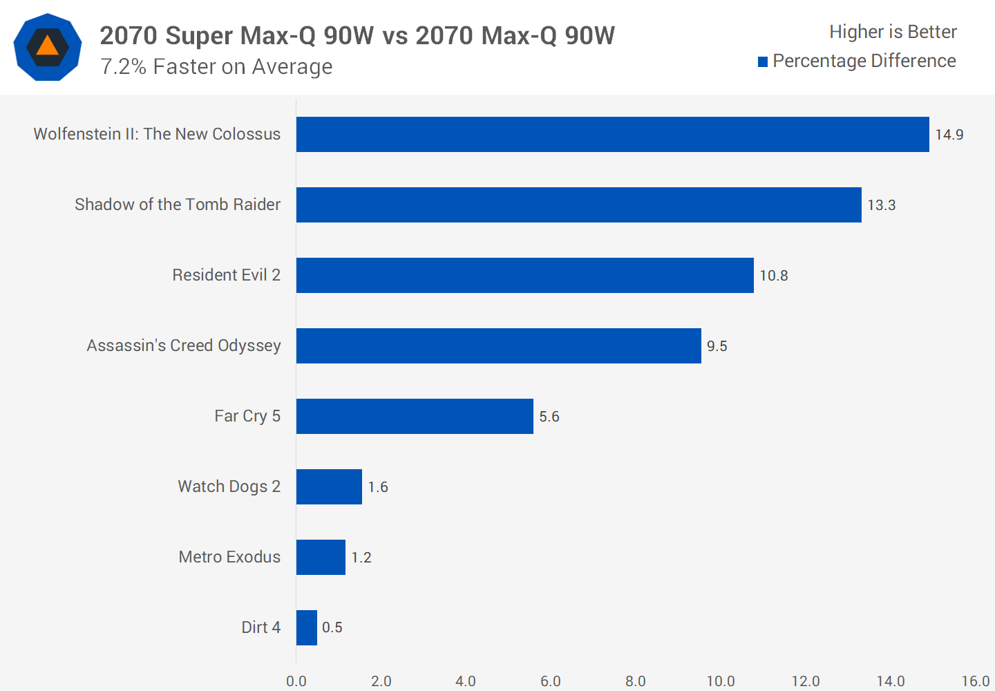 Lorsque l'on compare le RTX 2070 Super Max-Q au RTX 2070 Max-Q, tous deux fonctionnant à 90 W, le Super GPU est en moyenne 7% plus rapide. Cela variera selon les titres, certains jeux n'étaient pas beaucoup plus rapides, d'autres étaient jusqu'à 15% plus rapides. Cela dépendra de la façon dont le jeu utilise les ressources et si le jeu préfère la fréquence ou le nombre de cœurs.