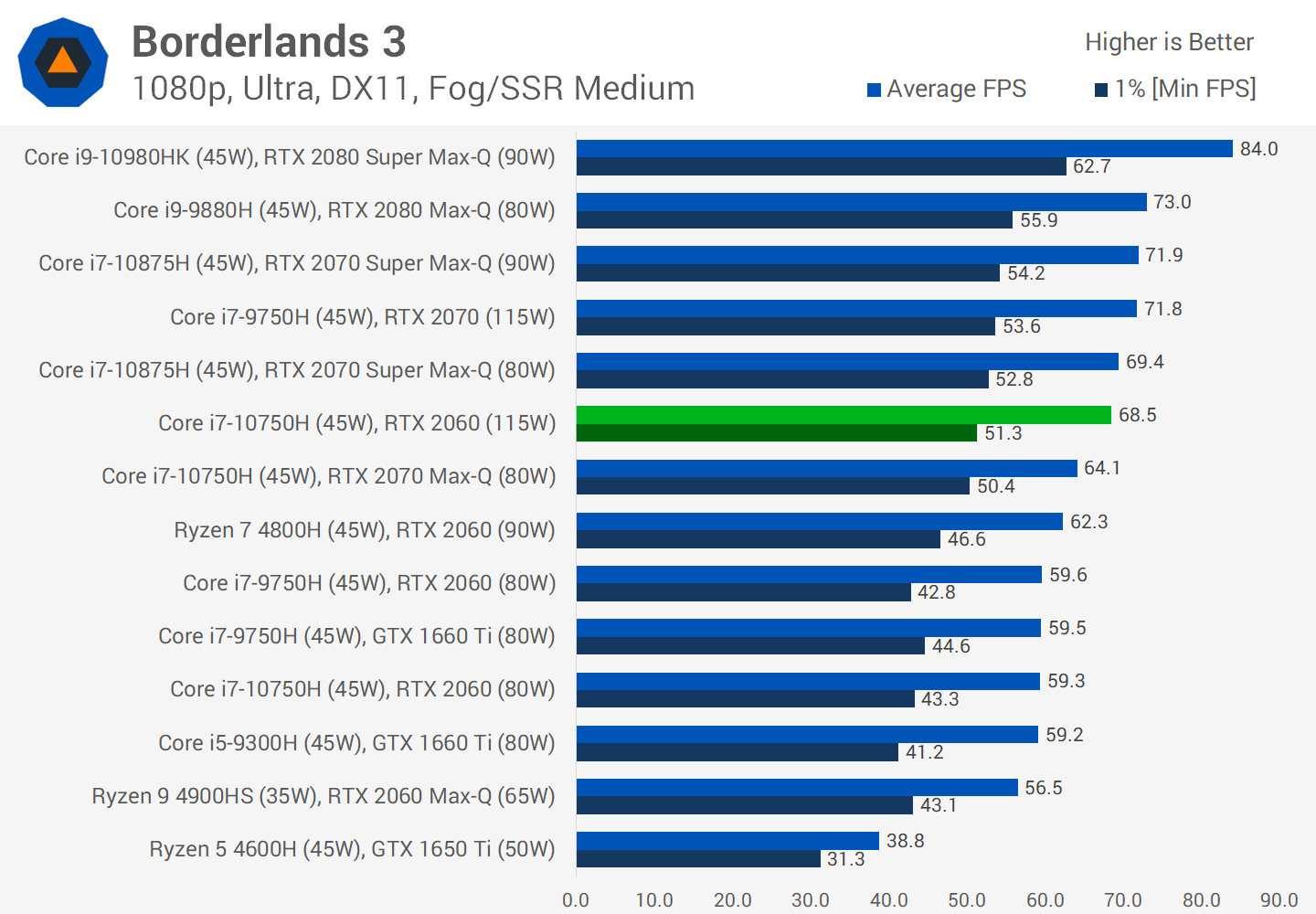Avec la puissance supplémentaire, le RTX 2060 (115 W) se situe au-dessus du RTX 2070 Max-Q, et pas loin derrière le RTX 2070 à 115 W. Borderlands 3 affiche un résultat solide pour le Super Max-Q 2080 avec une avance de 17% sur le Super Max-Q 2070 et le 2070 standard.