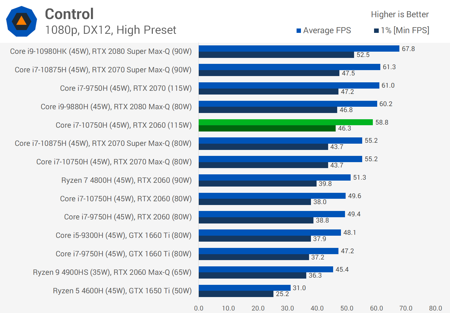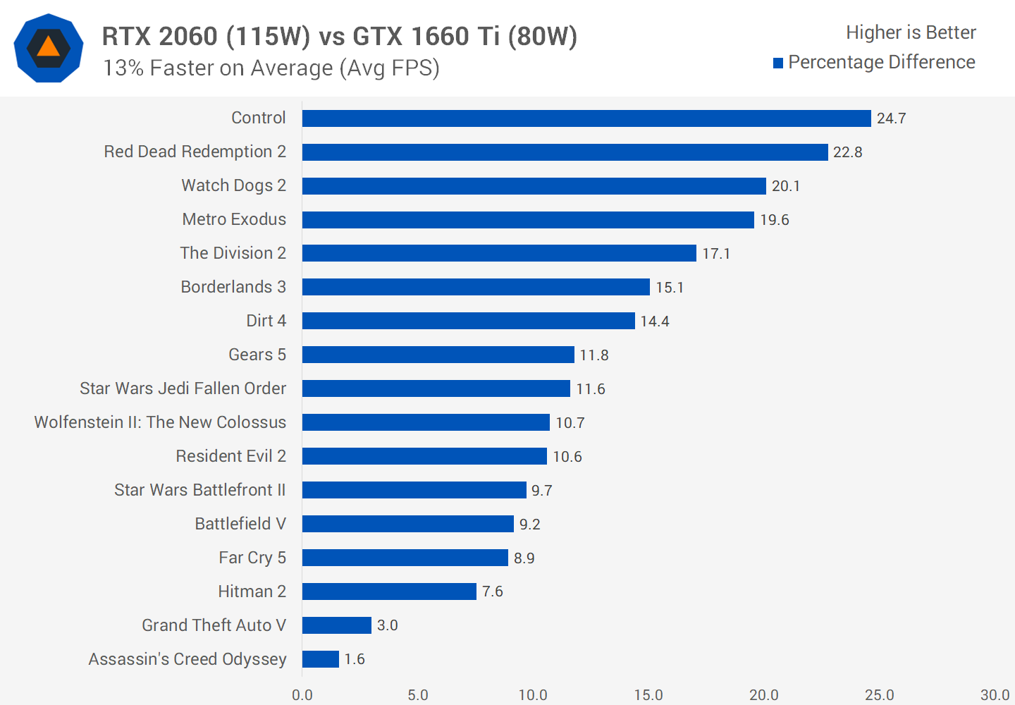 La raison en est peut-être que Nvidia a réalisé que le RTX 2060 n'était pas très convaincant lorsqu'il était limité à 80 W. En moyenne, le RTX 2060 à 80W fonctionne à égalité avec le GTX 1660 Ti qui est censé être un cran en dessous du RTX de base. Comme le montre le graphique ci-dessous, dans un meilleur scénario comme Control, le RTX 2060 est juste 5% plus rapide, mais dans le pire des cas, le GTX 1660 Ti peut être jusqu'à 6% plus rapide.