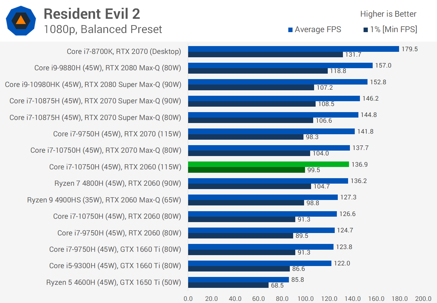 Resident Evil 2 est un exemple de jeu qui bénéficie à la fois des performances du processeur et du processeur graphique lors de l'utilisation du préréglage équilibré à 1080p. La variante RTX 2060 115W offre une fréquence d'images plus élevée que le modèle 80W lorsqu'elle est associée à un processeur graphique Intel, mais la combinaison des Ryzen 7 4800H et 90W RTX 2060 est un peu meilleure pour 1% de faibles performances tout en offrant des moyennes similaires. Tous les jeux ne peuvent pas bénéficier uniquement d'une augmentation de la puissance du GPU, le CPU est également important.