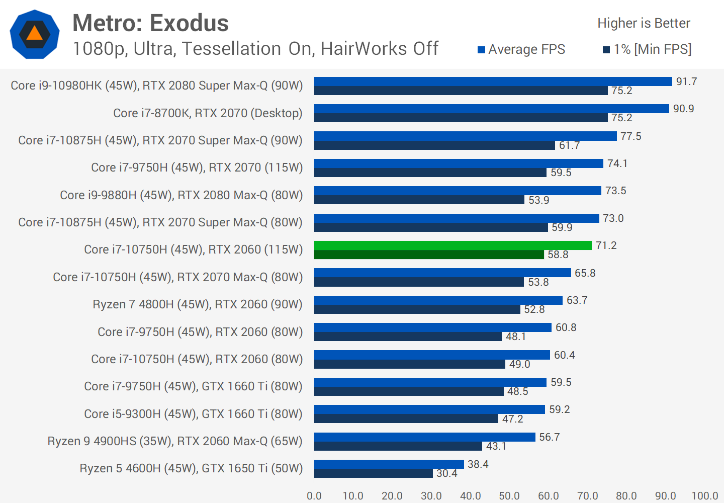 Dans Metro Exodus, avec 115 W de puissance à la barre, le RTX 2060 est capable de monter d'une classe en termes de performances, offrant maintenant une expérience assez constante de 60 FPS dans notre course de référence. Encore une fois, cette variante du 2060 est un meilleur choix que le RTX 2070 Max-Q, qui est un GPU 80W.