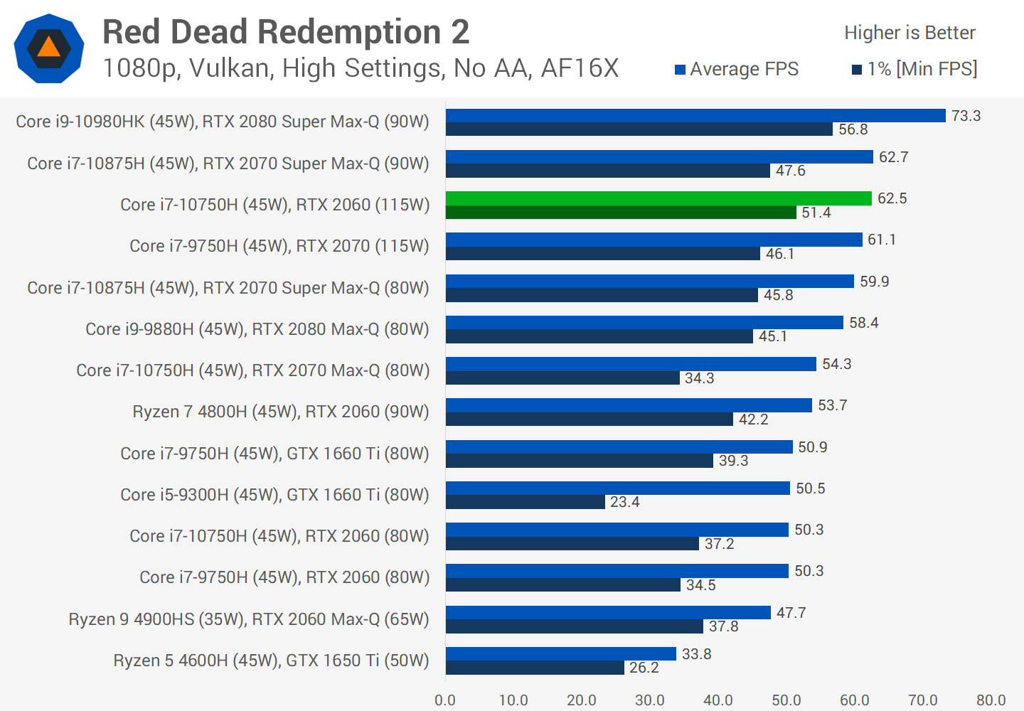 En commençant par un regard sur Red Dead Redemption 2, c'est l'un des meilleurs résultats pour le nouveau RTX 2060 à 115W. Nous recherchons à peu près les mêmes performances moyennes que la configuration RTX 2070 complète pour les ordinateurs portables, tout en surpassant de plus de 15% les anciennes configurations RTX 2060 et GTX 1660 Ti. La configuration 80W du 2070 Super Max-Q est plus lente en moyenne qu'un RTX 2070, mais plus rapide à 90W.