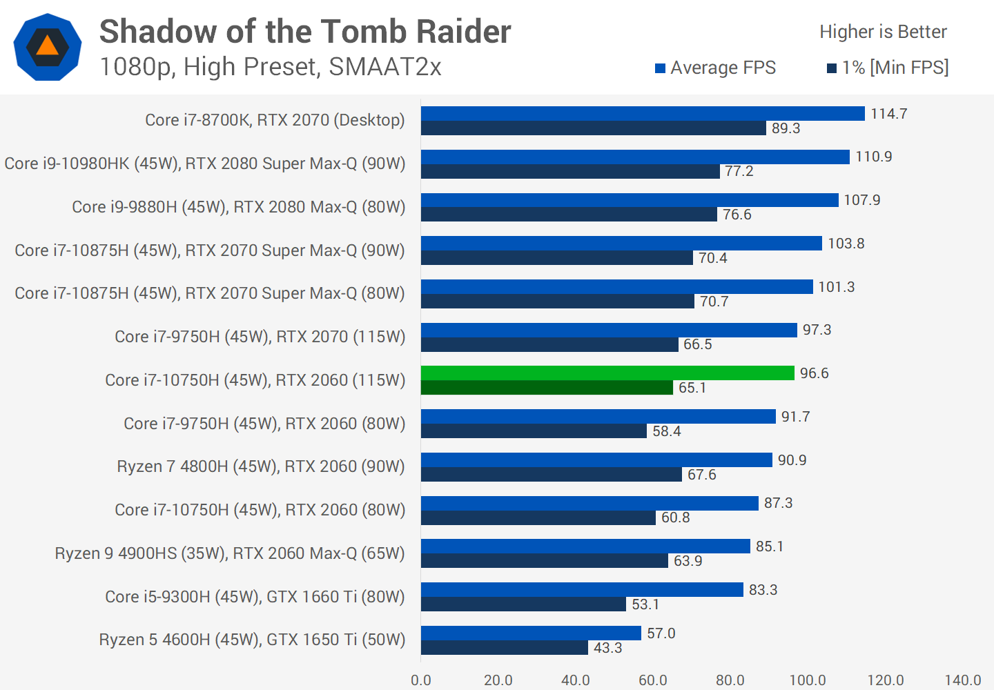 Shadow of the Tomb Raider affiche l'un des meilleurs résultats pour RTX 2070 Super Max-Q contre RTX 2070 Max-Q, tous deux fonctionnant à 90W. La variante Super est 13% plus rapide et impressionnante, même la variante 80W est plus rapide. Cela permet au 2070 Super Max-Q de gagner 4% plus rapidement que le 115W RTX 2070 malgré une consommation de seulement 80W.