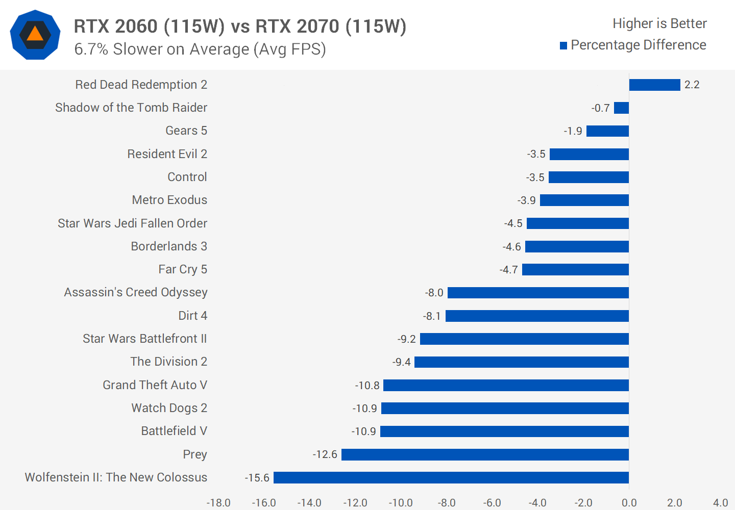 La nouvelle limite de puissance de 115 W permet au RTX 2060 de réduire considérablement l'écart sur le RTX 2070. Là où auparavant le 2060 configuré à 80 W était 17% plus lent en moyenne et parfois plus que cela, lorsque l'on compare le 115W 2060 au 115W 2070, le 2060 est maintenant seulement 7% plus lent. Dans certains jeux, les deux GPU fonctionnent de manière très similaire, dans d'autres, il y a plus d'écart de performance.