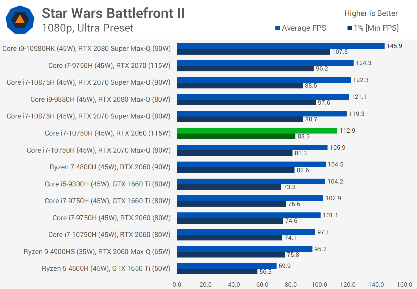 Star Wars Battlefront II est très favorable au RTX 2080 Super Max-Q, offrant des gains à deux chiffres par rapport aux RTX 2070, 2070 Super Max-Q et RTX 2080 Max-Q.